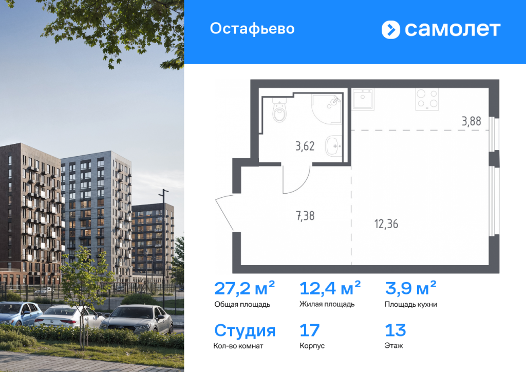Предлагается квартира студия комфорт-класса 27,24 кв.м в корпусе 17 на 13 этаже, в ЖК «Остафьево» Квартира с чистовой отделкой. Доступность дополнительных опций уточняйте у застройщика. Приобрести квартиру возможно по специальным акциям от застройщика, с текущими условиями акций можно ознакомиться в блоке «Акций». Цена динамическая и может отличаться, уточняйте актуальность у застройщика. «Остафьево» — масштабный жилой комплекс в Новой Москве, рядом с одноименным музеем-усадьбой и городским парком «Барыши». До станций МЦД «Щербинка» и «Остафьево» можно добраться на автомобиле за 5–7 минут. Часть домов уже сдана, на территории открыты две школы и три детских сада, а в будущем будет построена поликлиника, ТЦ, еще одна школа и три детских сада. Все необходимое рядом: на первых этажах домов работают магазины, аптеки и кафе. Дворы — приватные мини-парки без машин и посторонних. Кроме игровых площадок, для детей обустроили тематический плейхаб «Маяк». В будущем появятся плейхаб «Алиса в стране чудес», арт-объект «Тропа зеркал», а также большой ландшафтный парк. В квартале — монолитные дома комфортной высоты, от 10 этажей. Светлые фасады украшают кирпичные вставки в теплых природных оттенках.