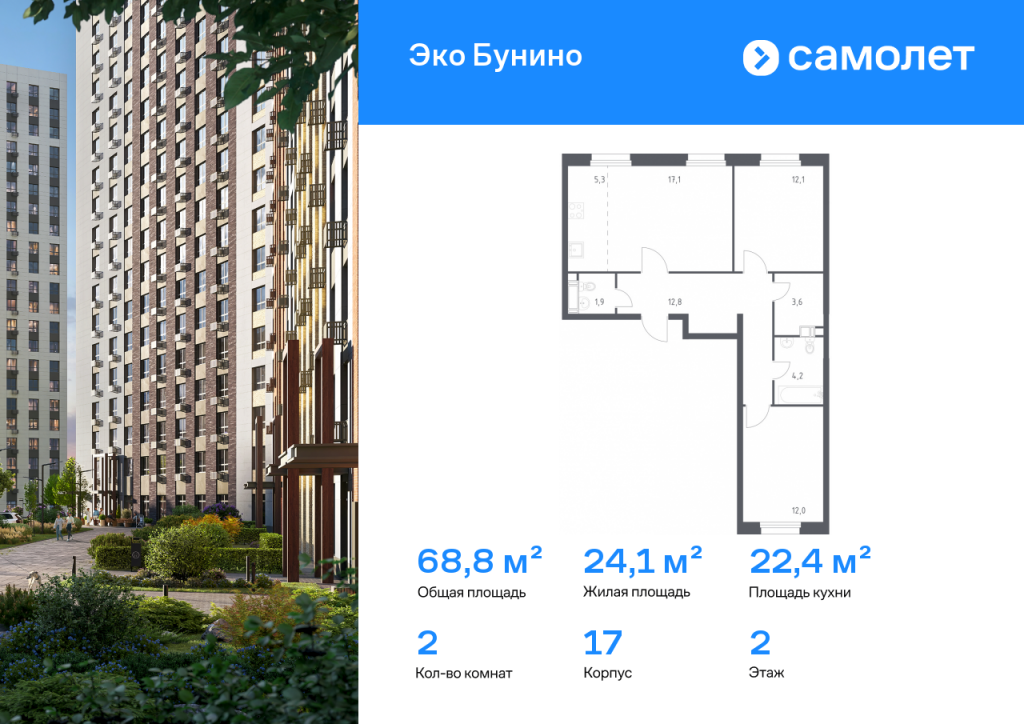 Предлагается 2-комнатная квартира комфорт-класса 68,8 кв.м в корпусе 17 на 2 этаже, в ЖК «Эко Бунино» Квартира с предчистовой отделкой. Доступность дополнительных опций уточняйте у застройщика. Приобрести квартиру возможно по специальным акциям от застройщика, с текущими условиями акций можно ознакомиться в блоке «Акций». Цена динамическая и может отличаться, уточняйте актуальность у застройщика. «Эко Бунино» — жилой комплекс в Новой Москве, полностью готовый для жизни. Уже построены школа и детские сады, открыты ледовая арена и магазины. Рядом — 2 станции метро и 3 лесопарка для прогулок. До станции метро «Новомосковская» — 20 минут пешком по экотропе. Во дворах-парках, закрытых от машин, комфортно и безопасно гулять. Здесь высажены уже взрослые деревья, которые создают прохладную тень в жаркий день. Ребенок любого возраста найдет увлекательное занятие в уже готовом плейхабе с большой горкой в виде слона и уникальным игровым оборудованием. Пока дети играют, родители могут прогуляться по бульвару или отдохнуть под навесом из растений. «Эко Бунино» — это 19 монолитных домов переменной этажности. Для облицовки используется навесной вентилируемый фасад и клинкерная плитка, которая имитирует кирпич. Переменная этажность обеспечивает хорошую инсоляцию дворов: в солнечные дни на территории особенно приятно гулять.