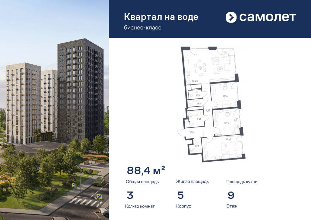 Предлагается 3-комнатная квартира бизнес-класса 88,43 кв.м в корпусе 5 на 9 этаже, в ЖК «Квартал на воде» Квартира без отделки. Доступность опции «отделка» и возможность комплектации мебелью и декором уточняйте у застройщика. Приобрести квартиру возможно по специальным акциям от застройщика, с текущими условиями акций можно ознакомиться в блоке «Акций». Цена динамическая и может отличаться, уточняйте актуальность у застройщика. «Квартал на воде» — жилой комплекс бизнес-класса на берегу Москвы-реки, в районе Печатники. Включает дома переменной этажности, собственную благоустроенную набережную и приватные дворы-парки. Проект — пример минималистичной архитектуры от бюро Kleinewelt Architekten. До МЦД-2 «Перерва» — 5 минут пешком. В конце 2027 года рядом откроется станция метро «Курьяново».