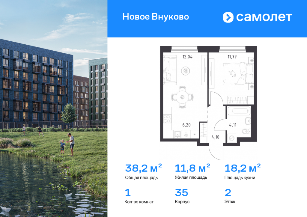 Предлагается 1-комнатная квартира комфорт-класса 38,22 кв.м в корпусе 35 на 2 этаже, в ЖК «Новое Внуково» Квартира без отделки. Доступность опции «отделка» и возможность комплектации мебелью и декором уточняйте у застройщика. Приобрести квартиру возможно по специальным акциям от застройщика, с текущими условиями акций можно ознакомиться в блоке «Акций». Цена динамическая и может отличаться, уточняйте актуальность у застройщика. «Новое Внуково» — это жилой комплекс в Новой Москве, у подножия берега реки Незнайка. Поблизости — живописные места для прогулок: народный парк «Ручеек», усадьба Старо-Никольское, Валуевский и Ульяновский лесопарки. Часть домов сдана и внутри района уже открыт детсад с бассейном, а в ближайшее время откроются еще 3 детсада, 2 школы и поликлиника. На территории проекта будет построен первый в России Центр Российской Федерации Баскетбола, где будут площадки с трибунами, тренажерный зал, кафе и конференц-зал. Дворы-парки закрыты от машин и посторонних. На территории — прогулочный маршрут вдоль реки Незнайка и набережная с шезлонгами и качелями для отдыха. Также здесь появится плейхаб «Незнайка на Луне», площадь для мероприятий с сухим фонтаном, летним кинотеатром и кафе. В жилом комплексе — монолитные дома высотой от 6 до 14 этажей. Фасады облицованы кирпичом природных оттенков.
