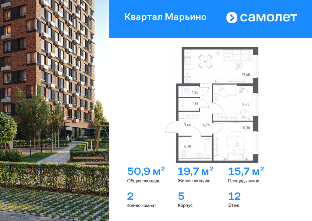 Предлагается 2-комнатная квартира комфорт-класса 50,93 кв.м в корпусе 5 на 12 этаже, в ЖК «Квартал Марьино» Квартира с чистовой отделкой. Доступность дополнительных опций уточняйте у застройщика. Приобрести квартиру возможно по специальным акциям от застройщика, с текущими условиями акций можно ознакомиться в блоке «Акций». Цена динамическая и может отличаться, уточняйте актуальность у застройщика. «Квартал Марьино» — проект в Новой Москве, в 18 км от МКАД, вблизи Валуевского лесопарка. Здесь будет все, чтобы получать удовольствие от жизни: приватные дворы-парки без машин, инфраструктура в шаговой доступности и общественные пространства для разнообразных занятий на свежем воздухе. До станции метро «Филатов луг» — 15 минут на машине по Филимонковскому шоссе. Живописные места для отдыха на природе — на расстоянии 2-5 км от дома. На территории будут построены 6 детских садов, 4 школы, поликлиника и спортивный комплекс, а также кафе, магазины и салоны красоты на первых этажах жилых домов. В закрытых дворах-парках предусмотрены игровые площадки, лужайки для пикников и йоги. Пространства для спокойного отдыха будут огорожены живыми изгородями. Дизайн-код проекта — «Полевые цветы». Он прослеживается в каждой детали — от натуральных оттенков фасадов до элементов благоустройства в эко-стиле.
