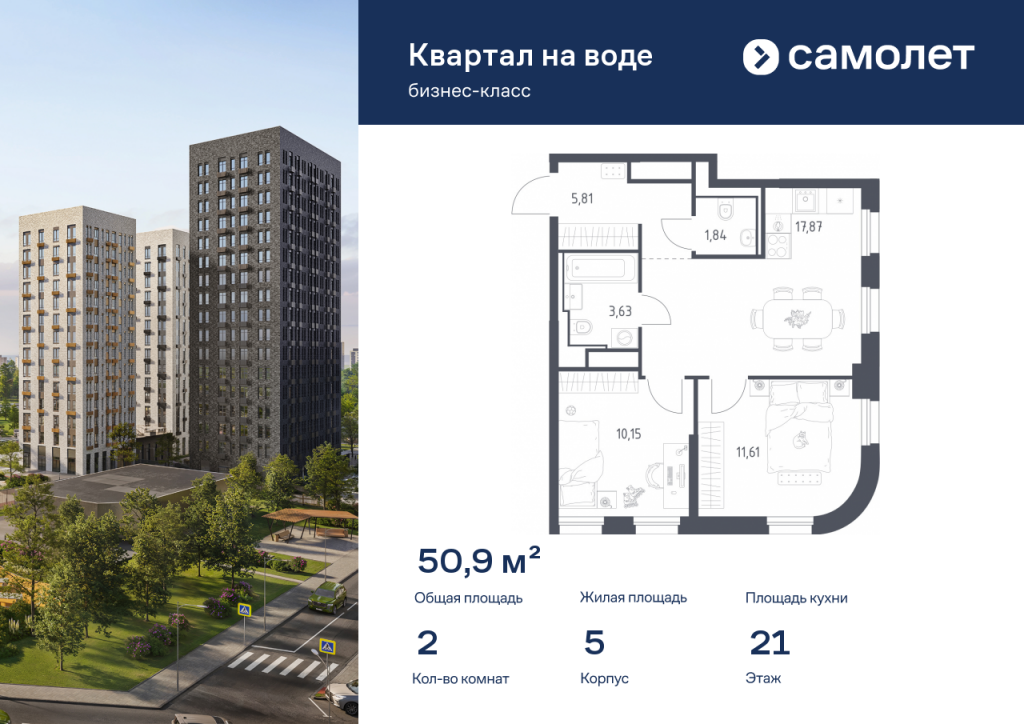 Предлагается 2-комнатная квартира бизнес-класса 50,91 кв.м в корпусе 5 на 21 этаже, в ЖК «Квартал на воде» Квартира без отделки. Доступность опции «отделка» и возможность комплектации мебелью и декором уточняйте у застройщика. Приобрести квартиру возможно по специальным акциям от застройщика, с текущими условиями акций можно ознакомиться в блоке «Акций». Цена динамическая и может отличаться, уточняйте актуальность у застройщика. «Квартал на воде» — жилой комплекс бизнес-класса на берегу Москвы-реки, в районе Печатники. Включает дома переменной этажности, собственную благоустроенную набережную и приватные дворы-парки. Проект — пример минималистичной архитектуры от бюро Kleinewelt Architekten. До МЦД-2 «Перерва» — 5 минут пешком. В конце 2027 года рядом откроется станция метро «Курьяново».