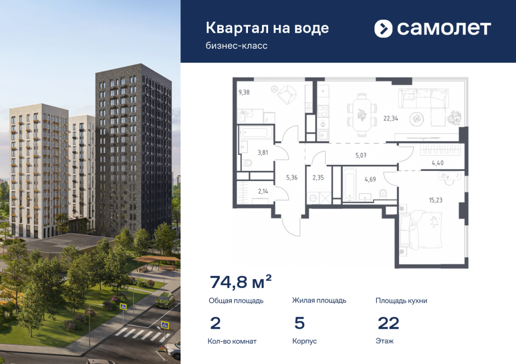 Предлагается 2-комнатная квартира бизнес-класса 74,77 кв.м в корпусе 5 на 22 этаже, в ЖК «Квартал на воде» Квартира без отделки. Доступность опции «отделка» и возможность комплектации мебелью и декором уточняйте у застройщика. Приобрести квартиру возможно по специальным акциям от застройщика, с текущими условиями акций можно ознакомиться в блоке «Акций». Цена динамическая и может отличаться, уточняйте актуальность у застройщика. «Квартал на воде» — жилой комплекс бизнес-класса на берегу Москвы-реки, в районе Печатники. Включает дома переменной этажности, собственную благоустроенную набережную и приватные дворы-парки. Проект — пример минималистичной архитектуры от бюро Kleinewelt Architekten. До МЦД-2 «Перерва» — 5 минут пешком. В конце 2027 года рядом откроется станция метро «Курьяново».