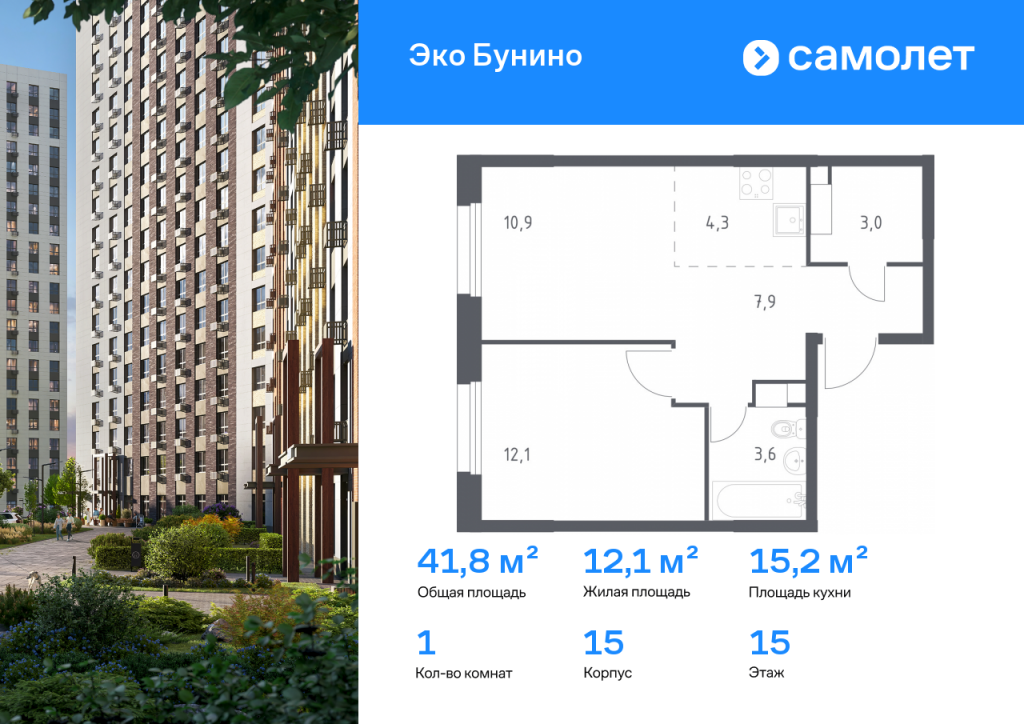 Предлагается 1-комнатная квартира комфорт-класса 41,8 кв.м в корпусе 15 на 15 этаже, в ЖК «Эко Бунино» Квартира без отделки. Доступность опции «отделка» и возможность комплектации мебелью и декором уточняйте у застройщика. Приобрести квартиру возможно по специальным акциям от застройщика, с текущими условиями акций можно ознакомиться в блоке «Акций». Цена динамическая и может отличаться, уточняйте актуальность у застройщика. «Эко Бунино» — жилой комплекс в Новой Москве, полностью готовый для жизни. Уже построены школа и детские сады, открыты ледовая арена и магазины. Рядом — 2 станции метро и 3 лесопарка для прогулок. До станции метро «Новомосковская» — 20 минут пешком по экотропе. Во дворах-парках, закрытых от машин, комфортно и безопасно гулять. Здесь высажены уже взрослые деревья, которые создают прохладную тень в жаркий день. Ребенок любого возраста найдет увлекательное занятие в уже готовом плейхабе с большой горкой в виде слона и уникальным игровым оборудованием. Пока дети играют, родители могут прогуляться по бульвару или отдохнуть под навесом из растений. «Эко Бунино» — это 19 монолитных домов переменной этажности. Для облицовки используется навесной вентилируемый фасад и клинкерная плитка, которая имитирует кирпич. Переменная этажность обеспечивает хорошую инсоляцию дворов: в солнечные дни на территории особенно приятно гулять.