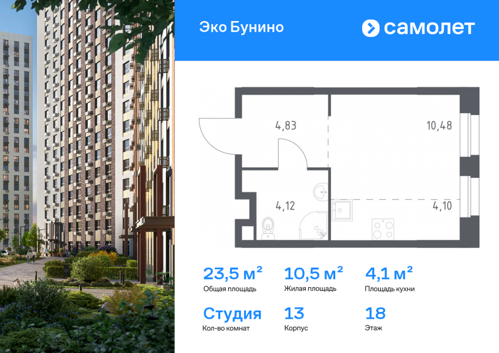 Предлагается квартира студия комфорт-класса 23,53 кв.м в корпусе 13 на 18 этаже, в ЖК «Эко Бунино» Квартира без отделки. Доступность опции «отделка» и возможность комплектации мебелью и декором уточняйте у застройщика. Приобрести квартиру возможно по специальным акциям от застройщика, с текущими условиями акций можно ознакомиться в блоке «Акций». Цена динамическая и может отличаться, уточняйте актуальность у застройщика. «Эко Бунино» — жилой комплекс в Новой Москве, полностью готовый для жизни. Уже построены школа и детские сады, открыты ледовая арена и магазины. Рядом — 2 станции метро и 3 лесопарка для прогулок. До станции метро «Новомосковская» — 20 минут пешком по экотропе. Во дворах-парках, закрытых от машин, комфортно и безопасно гулять. Здесь высажены уже взрослые деревья, которые создают прохладную тень в жаркий день. Ребенок любого возраста найдет увлекательное занятие в уже готовом плейхабе с большой горкой в виде слона и уникальным игровым оборудованием. Пока дети играют, родители могут прогуляться по бульвару или отдохнуть под навесом из растений. «Эко Бунино» — это 19 монолитных домов переменной этажности. Для облицовки используется навесной вентилируемый фасад и клинкерная плитка, которая имитирует кирпич. Переменная этажность обеспечивает хорошую инсоляцию дворов: в солнечные дни на территории особенно приятно гулять.