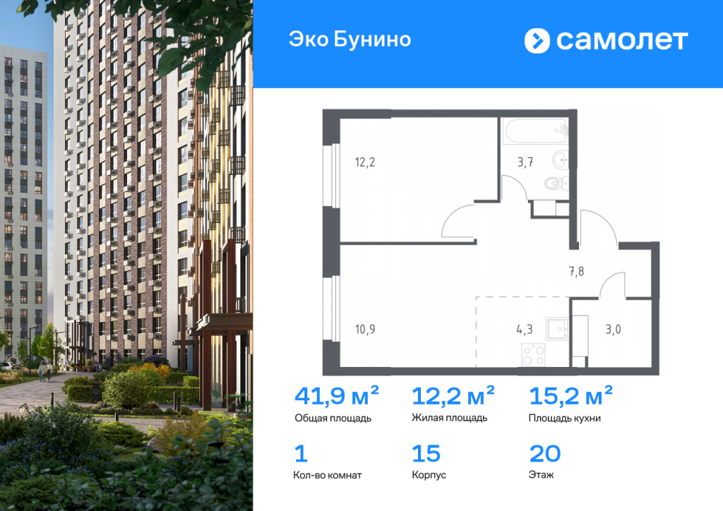 Предлагается 1-комнатная квартира комфорт-класса 41,9 кв.м в корпусе 15 на 19 этаже, в ЖК «Эко Бунино» Квартира с чистовой отделкой. Доступность дополнительных опций уточняйте у застройщика. Приобрести квартиру возможно по специальным акциям от застройщика, с текущими условиями акций можно ознакомиться в блоке «Акций». Цена динамическая и может отличаться, уточняйте актуальность у застройщика. «Эко Бунино» — жилой комплекс в Новой Москве, полностью готовый для жизни. Уже построены школа и детские сады, открыты ледовая арена и магазины. Рядом — 2 станции метро и 3 лесопарка для прогулок. До станции метро «Новомосковская» — 20 минут пешком по экотропе. Во дворах-парках, закрытых от машин, комфортно и безопасно гулять. Здесь высажены уже взрослые деревья, которые создают прохладную тень в жаркий день. Ребенок любого возраста найдет увлекательное занятие в уже готовом плейхабе с большой горкой в виде слона и уникальным игровым оборудованием. Пока дети играют, родители могут прогуляться по бульвару или отдохнуть под навесом из растений. «Эко Бунино» — это 19 монолитных домов переменной этажности. Для облицовки используется навесной вентилируемый фасад и клинкерная плитка, которая имитирует кирпич. Переменная этажность обеспечивает хорошую инсоляцию дворов: в солнечные дни на территории особенно приятно гулять.