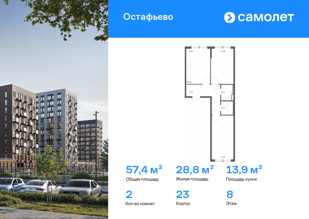 Предлагается 2-комнатная квартира комфорт-класса 57,4 кв.м в корпусе 23 на 8 этаже, в ЖК «Остафьево» Квартира с чистовой отделкой. Доступность дополнительных опций уточняйте у застройщика. Приобрести квартиру возможно по специальным акциям от застройщика, с текущими условиями акций можно ознакомиться в блоке «Акций». Цена динамическая и может отличаться, уточняйте актуальность у застройщика. «Остафьево» — масштабный жилой комплекс в Новой Москве, рядом с одноименным музеем-усадьбой и городским парком «Барыши». До станций МЦД «Щербинка» и «Остафьево» можно добраться на автомобиле за 5–7 минут. Часть домов уже сдана, на территории открыты две школы и три детских сада, а в будущем будет построена поликлиника, ТЦ, еще одна школа и три детских сада. Все необходимое рядом: на первых этажах домов работают магазины, аптеки и кафе. Дворы — приватные мини-парки без машин и посторонних. Кроме игровых площадок, для детей обустроили тематический плейхаб «Маяк». В будущем появятся плейхаб «Алиса в стране чудес», арт-объект «Тропа зеркал», а также большой ландшафтный парк. В квартале — монолитные дома комфортной высоты, от 10 этажей. Светлые фасады украшают кирпичные вставки в теплых природных оттенках.