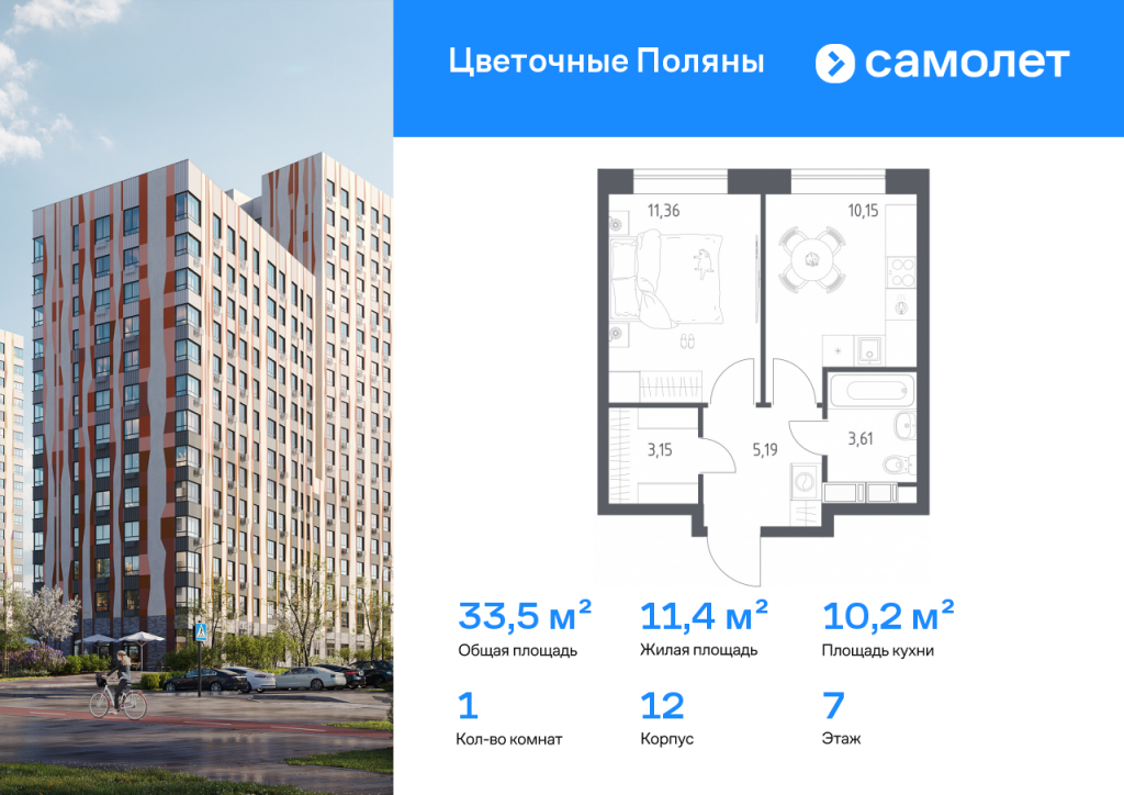 Предлагается 1-комнатная квартира комфорт-класса 33,46 кв.м в корпусе 12 на 7 этаже, в ЖК «Цветочные Поляны» Квартира без отделки. Доступность опции «отделка» и возможность комплектации мебелью и декором уточняйте у застройщика. Приобрести квартиру возможно по специальным акциям от застройщика, с текущими условиями акций можно ознакомиться в блоке «Акций». Цена динамическая и может отличаться, уточняйте актуальность у застройщика. «Цветочные Поляны» — жилой комплекс в Новой Москве, рядом с Валуевским и Ульяновским лесопарками. В квартале есть лесопарковая зона площадью 5 гектаров, где можно заниматься спортом, кататься на велосипеде и просто гулять среди деревьев. Также в пешей доступности — Валуевский лесопарк, дойти до которого можно вдоль «берега» декоративного сухого ручья. Те, кто любит отдых у воды, всегда могут прогуляться до реки Незнайки. В «Цветочных Полянах» предусмотрена образовательная инфраструктура для семей с детьми: уже построены первая школа и детский сад, в планах — строительство еще двух детских садов и второй школы. В квартале уже работают супермаркеты, кафе, салоны красоты, а в будущем появится свой торговый центр. Дома высотой до 22 этажей построены по монолитной технологии. Рисунок на фасадах отсылает к традиционному искусству Староселья — плетению кружев из стекляруса.