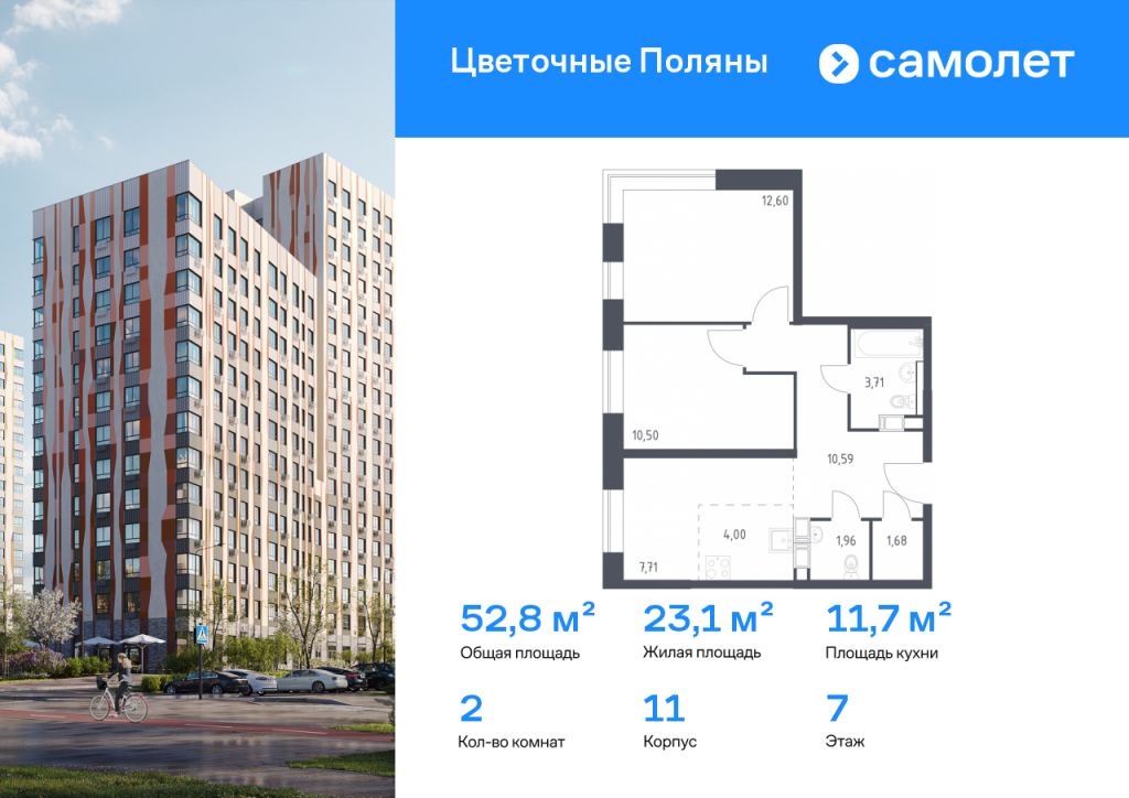 Предлагается 2-комнатная квартира комфорт-класса 52,75 кв.м в корпусе 11 на 7 этаже, в ЖК «Цветочные Поляны» Квартира без отделки. Доступность опции «отделка» и возможность комплектации мебелью и декором уточняйте у застройщика. Приобрести квартиру возможно по специальным акциям от застройщика, с текущими условиями акций можно ознакомиться в блоке «Акций». Цена динамическая и может отличаться, уточняйте актуальность у застройщика. «Цветочные Поляны» — жилой комплекс в Новой Москве, рядом с Валуевским и Ульяновским лесопарками. В квартале есть лесопарковая зона площадью 5 гектаров, где можно заниматься спортом, кататься на велосипеде и просто гулять среди деревьев. Также в пешей доступности — Валуевский лесопарк, дойти до которого можно вдоль «берега» декоративного сухого ручья. Те, кто любит отдых у воды, всегда могут прогуляться до реки Незнайки. В «Цветочных Полянах» предусмотрена образовательная инфраструктура для семей с детьми: уже построены первая школа и детский сад, в планах — строительство еще двух детских садов и второй школы. В квартале уже работают супермаркеты, кафе, салоны красоты, а в будущем появится свой торговый центр. Дома высотой до 22 этажей построены по монолитной технологии. Рисунок на фасадах отсылает к традиционному искусству Староселья — плетению кружев из стекляруса.