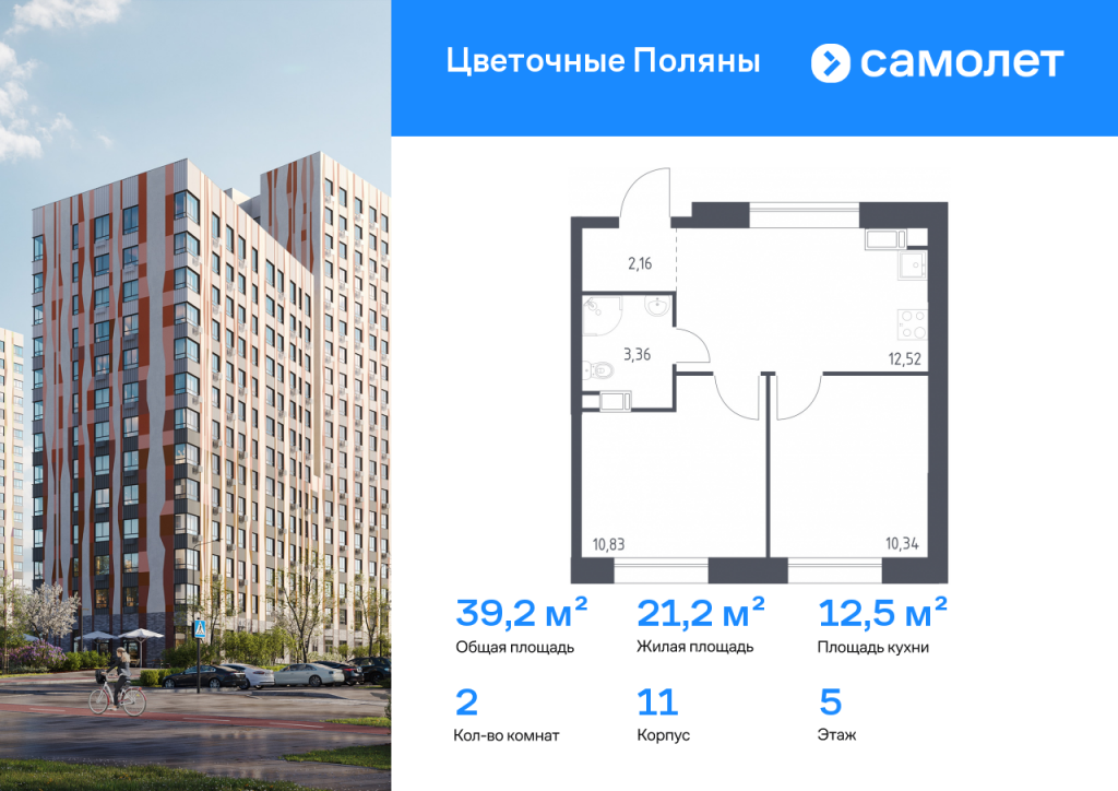 Предлагается 2-комнатная квартира комфорт-класса 39,21 кв.м в корпусе 11 на 5 этаже, в ЖК «Цветочные Поляны» Квартира без отделки. Доступность опции «отделка» и возможность комплектации мебелью и декором уточняйте у застройщика. Приобрести квартиру возможно по специальным акциям от застройщика, с текущими условиями акций можно ознакомиться в блоке «Акций». Цена динамическая и может отличаться, уточняйте актуальность у застройщика. «Цветочные Поляны» — жилой комплекс в Новой Москве, рядом с Валуевским и Ульяновским лесопарками. В квартале есть лесопарковая зона площадью 5 гектаров, где можно заниматься спортом, кататься на велосипеде и просто гулять среди деревьев. Также в пешей доступности — Валуевский лесопарк, дойти до которого можно вдоль «берега» декоративного сухого ручья. Те, кто любит отдых у воды, всегда могут прогуляться до реки Незнайки. В «Цветочных Полянах» предусмотрена образовательная инфраструктура для семей с детьми: уже построены первая школа и детский сад, в планах — строительство еще двух детских садов и второй школы. В квартале уже работают супермаркеты, кафе, салоны красоты, а в будущем появится свой торговый центр. Дома высотой до 22 этажей построены по монолитной технологии. Рисунок на фасадах отсылает к традиционному искусству Староселья — плетению кружев из стекляруса.