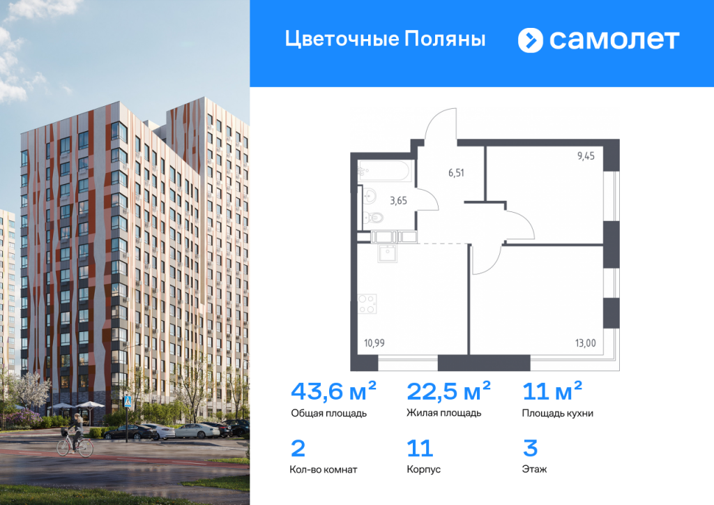 Предлагается 2-комнатная квартира комфорт-класса 43,6 кв.м в корпусе 11 на 3 этаже, в ЖК «Цветочные Поляны» Квартира без отделки. Доступность опции «отделка» и возможность комплектации мебелью и декором уточняйте у застройщика. Приобрести квартиру возможно по специальным акциям от застройщика, с текущими условиями акций можно ознакомиться в блоке «Акций». Цена динамическая и может отличаться, уточняйте актуальность у застройщика. «Цветочные Поляны» — жилой комплекс в Новой Москве, рядом с Валуевским и Ульяновским лесопарками. В квартале есть лесопарковая зона площадью 5 гектаров, где можно заниматься спортом, кататься на велосипеде и просто гулять среди деревьев. Также в пешей доступности — Валуевский лесопарк, дойти до которого можно вдоль «берега» декоративного сухого ручья. Те, кто любит отдых у воды, всегда могут прогуляться до реки Незнайки. В «Цветочных Полянах» предусмотрена образовательная инфраструктура для семей с детьми: уже построены первая школа и детский сад, в планах — строительство еще двух детских садов и второй школы. В квартале уже работают супермаркеты, кафе, салоны красоты, а в будущем появится свой торговый центр. Дома высотой до 22 этажей построены по монолитной технологии. Рисунок на фасадах отсылает к традиционному искусству Староселья — плетению кружев из стекляруса.