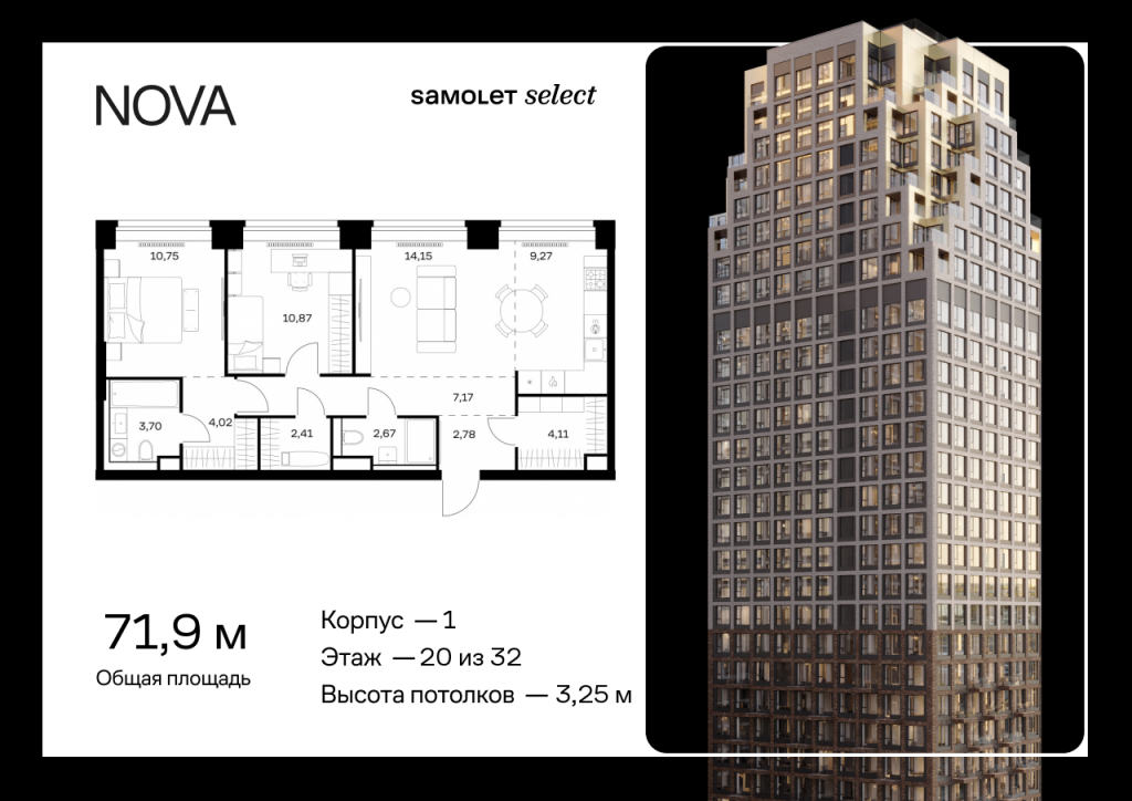 Предлагается 2-комнатная квартира премиум-класса 71,9 кв.м в корпусе 1 на 20 этаже, в ЖК «NOVA» Квартира без отделки. Доступность опции «отделка» и возможность комплектации мебелью и декором уточняйте у застройщика. Приобрести квартиру возможно по специальным акциям от застройщика, с текущими условиями акций можно ознакомиться в блоке «Акций». Цена динамическая и может отличаться, уточняйте актуальность у застройщика. «NOVA» — первый проект в премиальной линейке Samolet Select. Многоуровневое благоустройство объединяет разнообразные сценарии отдыха и развлечений. Из окон открывается завораживающий вид на Долину реки Сетунь. Собственные школа, детский сад, бизнес-центр и премиум фитнес-клуб — все это создает исключительные возможности для полной жизни. Редкие форматы квартир и дизайнерская отделка позволяют создать комфортное пространство в самом центре столицы.