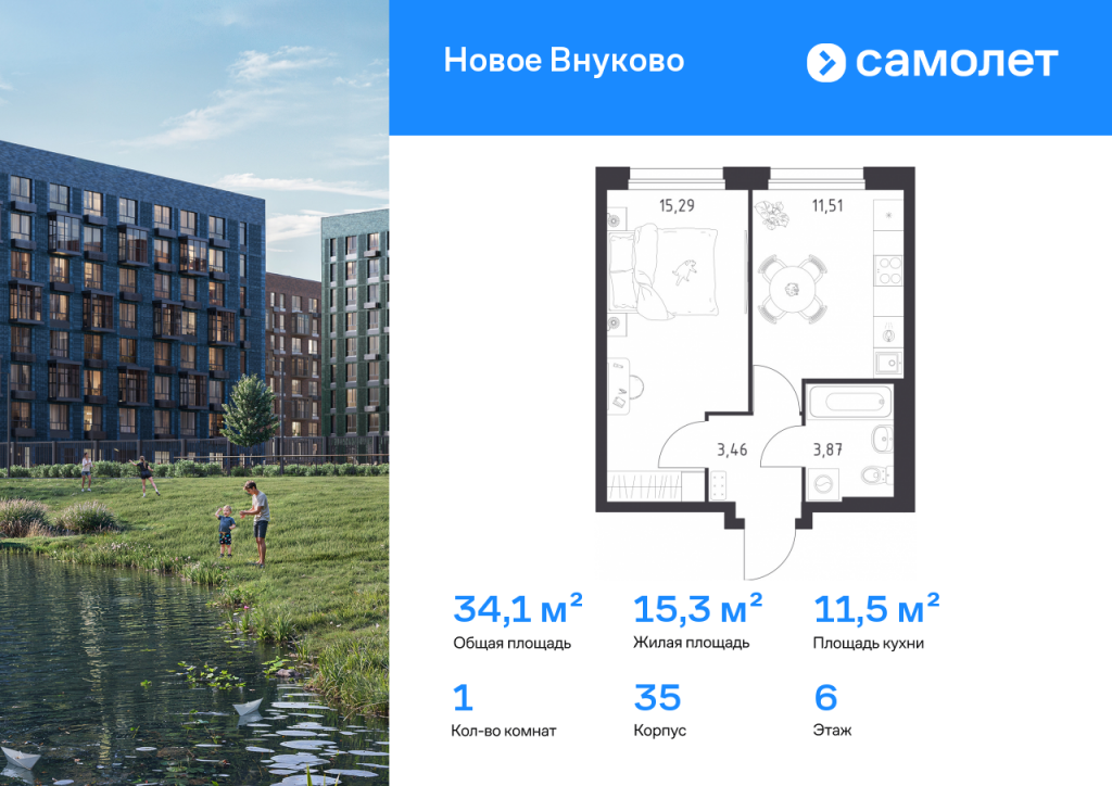 Предлагается 1-комнатная квартира комфорт-класса 34,13 кв.м в корпусе 35 на 6 этаже, в ЖК «Новое Внуково» Квартира без отделки. Доступность опции «отделка» и возможность комплектации мебелью и декором уточняйте у застройщика. Приобрести квартиру возможно по специальным акциям от застройщика, с текущими условиями акций можно ознакомиться в блоке «Акций». Цена динамическая и может отличаться, уточняйте актуальность у застройщика. «Новое Внуково» — это жилой комплекс в Новой Москве, у подножия берега реки Незнайка. Поблизости — живописные места для прогулок: народный парк «Ручеек», усадьба Старо-Никольское, Валуевский и Ульяновский лесопарки. Часть домов сдана и внутри района уже открыт детсад с бассейном, а в ближайшее время откроются еще 3 детсада, 2 школы и поликлиника. На территории проекта будет построен первый в России Центр Российской Федерации Баскетбола, где будут площадки с трибунами, тренажерный зал, кафе и конференц-зал. Дворы-парки закрыты от машин и посторонних. На территории — прогулочный маршрут вдоль реки Незнайка и набережная с шезлонгами и качелями для отдыха. Также здесь появится плейхаб «Незнайка на Луне», площадь для мероприятий с сухим фонтаном, летним кинотеатром и кафе. В жилом комплексе — монолитные дома высотой от 6 до 14 этажей. Фасады облицованы кирпичом природных оттенков.