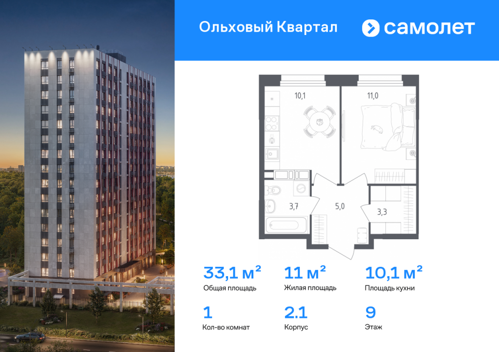 Предлагается 1-комнатная квартира комфорт-класса 33,1 кв.м в корпусе 2.1 на 9 этаже, в ЖК «Ольховый Квартал» Квартира без отделки. Доступность опции «отделка» и возможность комплектации мебелью и декором уточняйте у застройщика. Приобрести квартиру возможно по специальным акциям от застройщика, с текущими условиями акций можно ознакомиться в блоке «Акций». Цена динамическая и может отличаться, уточняйте актуальность у застройщика. Жилой комплекс «Ольховый Квартал» — проект комфорт-класса в Новой Москве, в пешей доступности от 3 станций метро: «Ольховая», «Прокшино» и «Коммунарка» новой Троицкой ветки. Это 3 дома высотой 16 этажей с приватными зелеными дворами. Территория квартала граничит с зеленой рощей, а через дорогу — лесопарк для ежедневных прогулок. Рядом 7 фитнес-клубов, магазины, кафе, медицинские центры, а также школы и детские сады. Пространства для тихого отдыха будут огорожены живыми изгородями. Также высадят ель, которая создаст новогоднее настроение зимой. Предусмотрены современные детские площадки для ребят всех возрастов, воркаут-зона, площадка для выгула и тренировки собак. Любители спортивных игр оценят баскетбольную площадку и столы для настольного тенниса. Светлые фасады гармонируют с окружающей природой. Облицовочный материал — фиброцементные панели. Вечером фасады украшает архитектурная подсветка.