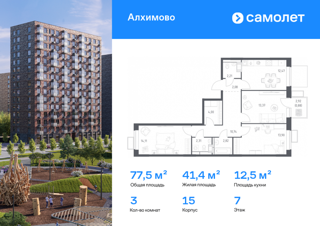 Предлагается 3-комнатная квартира комфорт-класса 77,5 кв.м в корпусе 15 на 7 этаже, в ЖК «Алхимово» Квартира с чистовой отделкой. Доступность дополнительных опций уточняйте у застройщика. Приобрести квартиру возможно по специальным акциям от застройщика, с текущими условиями акций можно ознакомиться в блоке «Акций». Цена динамическая и может отличаться, уточняйте актуальность у застройщика. «Алхимово» — жилой комплекс в Новой Москве, в 16 км от МКАД. Рядом — живописный Дубровицкий лесопарк и река Десна. На территории уже есть свои школа и детский сад, ведется строительство еще одного детского сада. Супермаркеты, аптеки и кафе — в паре шагов от дома. В будущем появится свой торговый центр. В квартале есть воркаут-зона, игровые площадки, отдельная площадка для выгула собак. Дворы закрыты от машин, для автомобилистов предусмотрен многоуровневый паркинг. В проекте — монолитные дома высотой от 8 до 16 этажей. Фасады облицованы декоративным кирпичом естественных оттенков.
