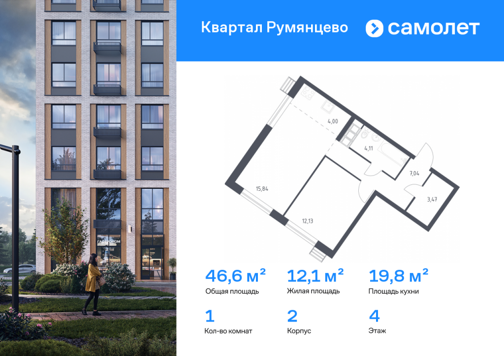 Строим кварталы для жизни с заботой о будущем. Предлагается 1-комнатная квартира комфорт-класса 46,59 кв.м в корпусе 2 на 4 этаже, в ЖК «Квартал Румянцево» Квартира с чистовой отделкой. Доступность дополнительных опций уточняйте у застройщика. Приобрести квартиру возможно по специальным акциям от застройщика, с текущими условиями акций можно ознакомиться в блоке «Акций». Цена динамическая и может отличаться, уточняйте актуальность у застройщика. «Квартал Румянцево» — современный проект в 2 км от МКАД, в экологически благоприятном районе Новой Москвы. Территория квартала утопает в зелени, а вся необходимая инфраструктура, включая учебно-воспитательный комплекс, — в шаговой доступности. Близость метро «Румянцево» и «Саларьево» делает проект отличным вариантом для тех, кому важно быстро добираться в любую точку города. До ближайших лесопарков — Тропаревского и Троицкого — можно прокатиться на велосипеде. Дорога займет всего 10 минут. Для детей построят учебно-воспитательный комплекс, в который войдут общеобразовательная школа, детский сад, а также кружки и секции. На первых этажах жилых домов откроются магазины и аптеки, пекарни и кафе. На территории жилого комплекса появится большой сад с многолетниками, аллеи для прогулок и зеленые прогулочные бульвары. А для велосипедистов спроектирована сеть велодорожек, по которым можно добраться до ближайших станций метро.