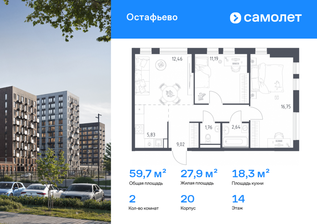 Строим кварталы для жизни с заботой о будущем. Предлагается 2-комнатная квартира комфорт-класса 59,65 кв.м в корпусе 20 на 14 этаже, в ЖК «Остафьево» Квартира с чистовой отделкой. Доступность дополнительных опций уточняйте у застройщика. Приобрести квартиру возможно по специальным акциям от застройщика, с текущими условиями акций можно ознакомиться в блоке «Акций». Цена динамическая и может отличаться, уточняйте актуальность у застройщика. «Остафьево» — масштабный жилой комплекс в Новой Москве, рядом с одноименным музеем-усадьбой и городским парком «Барыши». До станций МЦД «Щербинка» и «Остафьево» можно добраться на автомобиле за 5–7 минут. Часть домов уже сдана, на территории открыты две школы и три детских сада, а в будущем будет построена поликлиника, ТЦ, еще одна школа и три детских сада. Все необходимое рядом: на первых этажах домов работают магазины, аптеки и кафе. Дворы — приватные мини-парки без машин и посторонних. Кроме игровых площадок, для детей обустроили тематический плейхаб «Маяк». В будущем появятся плейхаб «Алиса в стране чудес», арт-объект «Тропа зеркал», а также большой ландшафтный парк. В квартале — монолитные дома комфортной высоты, от 10 этажей. Светлые фасады украшают кирпичные вставки в теплых природных оттенках.