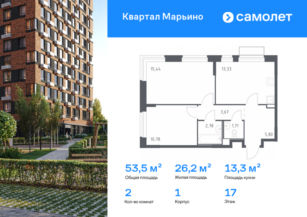 Строим кварталы для жизни с заботой о будущем. Предлагается 2-комнатная квартира комфорт-класса 53,51 кв.м в корпусе 1 на 17 этаже, в ЖК «Квартал Марьино» Квартира с чистовой отделкой. Доступность дополнительных опций уточняйте у застройщика. Приобрести квартиру возможно по специальным акциям от застройщика, с текущими условиями акций можно ознакомиться в блоке «Акций». Цена динамическая и может отличаться, уточняйте актуальность у застройщика. «Квартал Марьино» — проект в Новой Москве, в 18 км от МКАД, вблизи Валуевского лесопарка. Здесь будет все, чтобы получать удовольствие от жизни: приватные дворы-парки без машин, инфраструктура в шаговой доступности и общественные пространства для разнообразных занятий на свежем воздухе. До станции метро «Филатов луг» — 15 минут на машине по Филимонковскому шоссе. Живописные места для отдыха на природе — на расстоянии 2-5 км от дома. На территории будут построены 6 детских садов, 4 школы, поликлиника и спортивный комплекс, а также кафе, магазины и салоны красоты на первых этажах жилых домов. В закрытых дворах-парках предусмотрены игровые площадки, лужайки для пикников и йоги. Пространства для спокойного отдыха будут огорожены живыми изгородями. Дизайн-код проекта — «Полевые цветы». Он прослеживается в каждой детали — от натуральных оттенков фасадов до элементов благоустройства в эко-стиле.