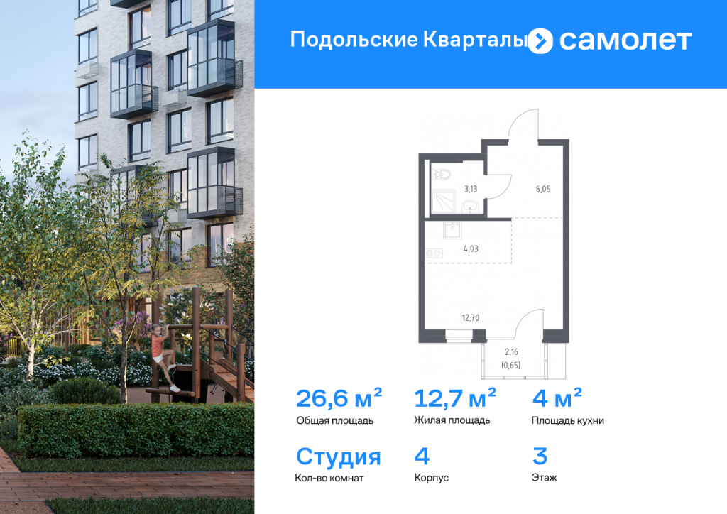 Строим кварталы для жизни с заботой о будущем. Предлагается квартира студия комфорт-класса 26,56 кв.м в корпусе 4 на 3 этаже, в ЖК «Подольские Кварталы» Квартира без отделки. Доступность опции «отделка» и возможность комплектации мебелью и декором уточняйте у застройщика. Приобрести квартиру возможно по специальным акциям от застройщика, с текущими условиями акций можно ознакомиться в блоке «Акций». Цена динамическая и может отличаться, уточняйте актуальность у застройщика. «Подольские кварталы» — жилой комплекс в Новой Москве, рядом с Дубровицким лесом и рекой Десной. До станции МЦД-2 "Остафьево" - 5 минут на общественном транспорте, до станции МЦД-2 «Силикатная» — 8 минут на машине. Рядом — музей-заповедник «Остафьево», усадьбы Плещеево и Дубровицы. В квартале будут детский сад на 200 мест и учебно-воспитательный комплекс на 1 500 мест, в который войдут школа и детский сад. Первые этажи жилых корпусов займут квартиры, кафе, магазины и салоны красоты. Дворы-парки будут радовать жителей цветением и зеленью: здесь высадят липы, сосны, ели, клены и сирень. Плэйхаб станет местом встреч всех любителей активного отдыха: застройщик оборудует зоны тренажеров и воркаута, площадки для игр в настольный теннис, мяч, шахматы. Также появятся современные игровые площадки для детей. Для автовладельцев предусмотрен многоуровневый паркинг. В проекте — монолитные дома высотой от 9 до 12 этажей. Теплые оттенки фасадов соответствуют дизайн-коду «Янтарный берег». Фасады облицованы ложковой кирпичной кладкой.