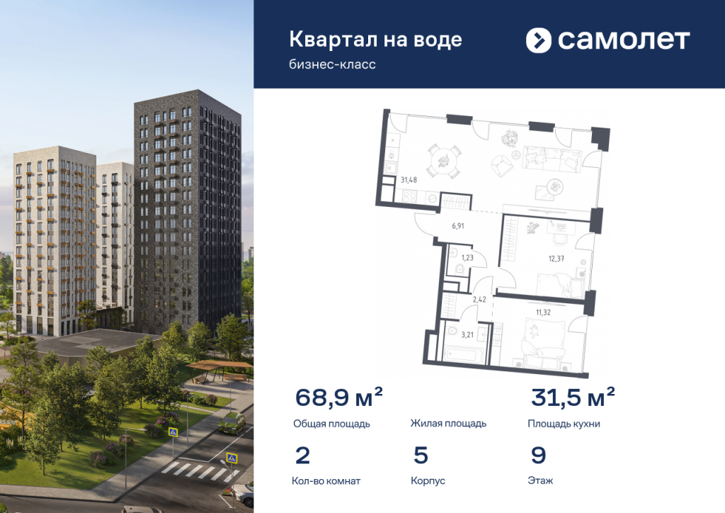 Строим кварталы для жизни с заботой о будущем. Предлагается 2-комнатная квартира бизнес-класса 68,94 кв.м в корпусе 5 на 9 этаже, в ЖК «Квартал на воде» Квартира без отделки. Доступность опции «отделка» и возможность комплектации мебелью и декором уточняйте у застройщика. Приобрести квартиру возможно по специальным акциям от застройщика, с текущими условиями акций можно ознакомиться в блоке «Акций». Цена динамическая и может отличаться, уточняйте актуальность у застройщика. «Квартал на воде» — жилой комплекс бизнес-класса на берегу Москвы-реки, в районе Печатники. Включает дома переменной этажности, собственную благоустроенную набережную и приватные дворы-парки. Проект — пример минималистичной архитектуры от бюро Kleinewelt Architekten. До МЦД-2 «Перерва» — 5 минут пешком. В конце 2027 года рядом откроется станция метро «Курьяново».