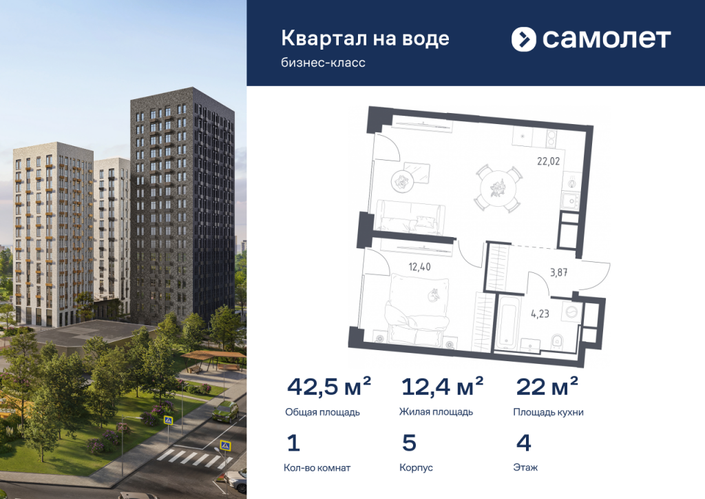 Строим кварталы для жизни с заботой о будущем. Предлагается 1-комнатная квартира бизнес-класса 42,52 кв.м в корпусе 5 на 4 этаже, в ЖК «Квартал на воде» Квартира без отделки. Доступность опции «отделка» и возможность комплектации мебелью и декором уточняйте у застройщика. Приобрести квартиру возможно по специальным акциям от застройщика, с текущими условиями акций можно ознакомиться в блоке «Акций». Цена динамическая и может отличаться, уточняйте актуальность у застройщика. «Квартал на воде» — жилой комплекс бизнес-класса на берегу Москвы-реки, в районе Печатники. Включает дома переменной этажности, собственную благоустроенную набережную и приватные дворы-парки. Проект — пример минималистичной архитектуры от бюро Kleinewelt Architekten. До МЦД-2 «Перерва» — 5 минут пешком. В конце 2027 года рядом откроется станция метро «Курьяново».