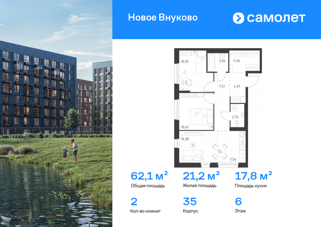 Строим кварталы для жизни с заботой о будущем. Предлагается 2-комнатная квартира комфорт-класса 62,12 кв.м в корпусе 35 на 6 этаже, в ЖК «Новое Внуково» Квартира без отделки. Доступность опции «отделка» и возможность комплектации мебелью и декором уточняйте у застройщика. Приобрести квартиру возможно по специальным акциям от застройщика, с текущими условиями акций можно ознакомиться в блоке «Акций». Цена динамическая и может отличаться, уточняйте актуальность у застройщика. «Новое Внуково» — это жилой комплекс в Новой Москве, у подножия берега реки Незнайка. Поблизости — живописные места для прогулок: народный парк «Ручеек», усадьба Старо-Никольское, Валуевский и Ульяновский лесопарки. Часть домов сдана и внутри района уже открыт детсад с бассейном, а в ближайшее время откроются еще 3 детсада, 2 школы и поликлиника. На территории проекта будет построен первый в России Центр Российской Федерации Баскетбола, где будут площадки с трибунами, тренажерный зал, кафе и конференц-зал. Дворы-парки закрыты от машин и посторонних. На территории — прогулочный маршрут вдоль реки Незнайка и набережная с шезлонгами и качелями для отдыха. Также здесь появится плейхаб «Незнайка на Луне», площадь для мероприятий с сухим фонтаном, летним кинотеатром и кафе. В жилом комплексе — монолитные дома высотой от 6 до 14 этажей. Фасады облицованы кирпичом природных оттенков.