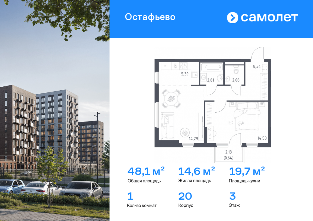 Строим кварталы для жизни с заботой о будущем. Предлагается 1-комнатная квартира комфорт-класса 48,11 кв.м в корпусе 20 на 3 этаже, в ЖК «Остафьево» Квартира без отделки. Доступность опции «отделка» и возможность комплектации мебелью и декором уточняйте у застройщика. Приобрести квартиру возможно по специальным акциям от застройщика, с текущими условиями акций можно ознакомиться в блоке «Акций». Цена динамическая и может отличаться, уточняйте актуальность у застройщика. «Остафьево» — масштабный жилой комплекс в Новой Москве, рядом с одноименным музеем-усадьбой и городским парком «Барыши». До станций МЦД «Щербинка» и «Остафьево» можно добраться на автомобиле за 5–7 минут. Часть домов уже сдана, на территории открыты две школы и три детских сада, а в будущем будет построена поликлиника, ТЦ, еще одна школа и три детских сада. Все необходимое рядом: на первых этажах домов работают магазины, аптеки и кафе. Дворы — приватные мини-парки без машин и посторонних. Кроме игровых площадок, для детей обустроили тематический плейхаб «Маяк». В будущем появятся плейхаб «Алиса в стране чудес», арт-объект «Тропа зеркал», а также большой ландшафтный парк. В квартале — монолитные дома комфортной высоты, от 10 этажей. Светлые фасады украшают кирпичные вставки в теплых природных оттенках.