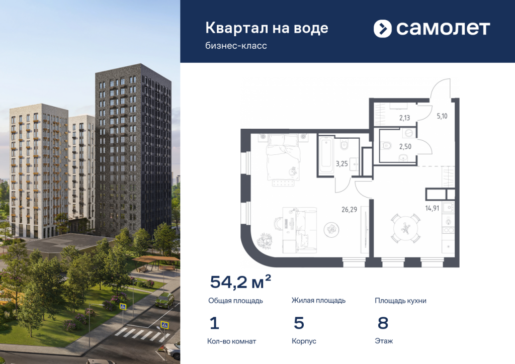 Строим кварталы для жизни с заботой о будущем. Предлагается 1-комнатная квартира бизнес-класса 54,18 кв.м в корпусе 5 на 8 этаже, в ЖК «Квартал на воде» Квартира без отделки. Доступность опции «отделка» и возможность комплектации мебелью и декором уточняйте у застройщика. Приобрести квартиру возможно по специальным акциям от застройщика, с текущими условиями акций можно ознакомиться в блоке «Акций». Цена динамическая и может отличаться, уточняйте актуальность у застройщика. «Квартал на воде» — жилой комплекс бизнес-класса на берегу Москвы-реки, в районе Печатники. Включает дома переменной этажности, собственную благоустроенную набережную и приватные дворы-парки. Проект — пример минималистичной архитектуры от бюро Kleinewelt Architekten. До МЦД-2 «Перерва» — 5 минут пешком. В конце 2027 года рядом откроется станция метро «Курьяново».