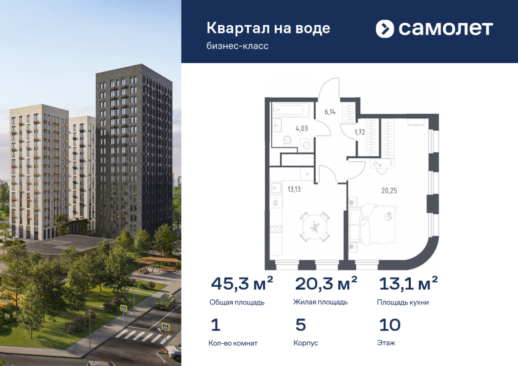 Строим кварталы для жизни с заботой о будущем. Предлагается 1-комнатная квартира бизнес-класса 45,27 кв.м в корпусе 5 на 10 этаже, в ЖК «Квартал на воде» Квартира без отделки. Доступность опции «отделка» и возможность комплектации мебелью и декором уточняйте у застройщика. Приобрести квартиру возможно по специальным акциям от застройщика, с текущими условиями акций можно ознакомиться в блоке «Акций». Цена динамическая и может отличаться, уточняйте актуальность у застройщика. «Квартал на воде» — жилой комплекс бизнес-класса на берегу Москвы-реки, в районе Печатники. Включает дома переменной этажности, собственную благоустроенную набережную и приватные дворы-парки. Проект — пример минималистичной архитектуры от бюро Kleinewelt Architekten. До МЦД-2 «Перерва» — 5 минут пешком. В конце 2027 года рядом откроется станция метро «Курьяново».