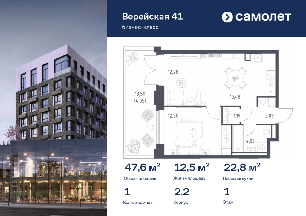 Строим кварталы для жизни с заботой о будущем. Предлагается 1-комнатная квартира бизнес-класса 47,62 кв.м в корпусе 2.2 на 1 этаже, в «Верейская 41» Квартира без отделки. Доступность опции «отделка» и возможность комплектации мебелью и декором уточняйте у застройщика. Приобрести квартиру возможно по специальным акциям от застройщика, с текущими условиями акций можно ознакомиться в блоке «Акций». Цена динамическая и может отличаться, уточняйте актуальность у застройщика. «Верейская 41» — проект бизнес-класса рядом с «Долиной реки Сетунь» и Кутузовским проспектом. Из панорамных окон открываются виды на природный заказник. Комплекс включает 4 урбан-блока высотой до 14 этажей, зеленые террасы, сад с навесами из растений, спортивные и игровые площадки, плоскостной и 2 подземных паркинга. Планировки сдаются с дизайнерской отделкой в природных тонах.