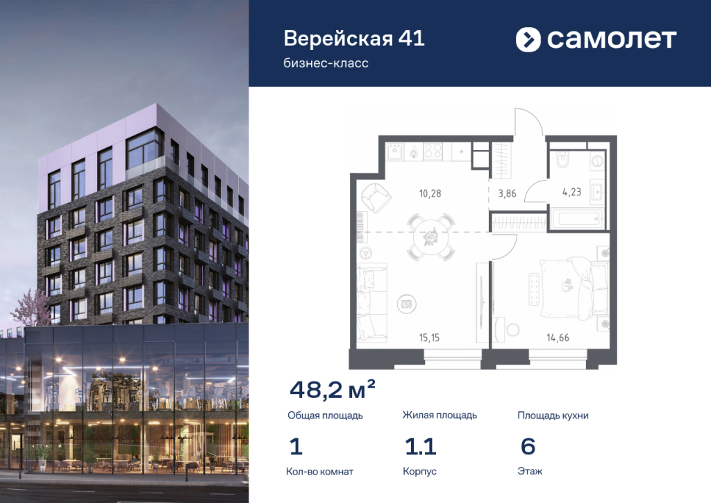 Строим кварталы для жизни с заботой о будущем. Предлагается 1-комнатная квартира бизнес-класса 48,18 кв.м в корпусе 1.1 на 6 этаже, в «Верейская 41» Квартира без отделки. Доступность опции «отделка» и возможность комплектации мебелью и декором уточняйте у застройщика. Приобрести квартиру возможно по специальным акциям от застройщика, с текущими условиями акций можно ознакомиться в блоке «Акций». Цена динамическая и может отличаться, уточняйте актуальность у застройщика. «Верейская 41» — проект бизнес-класса рядом с «Долиной реки Сетунь» и Кутузовским проспектом. Из панорамных окон открываются виды на природный заказник. Комплекс включает 4 урбан-блока высотой до 14 этажей, зеленые террасы, сад с навесами из растений, спортивные и игровые площадки, плоскостной и 2 подземных паркинга. Планировки сдаются с дизайнерской отделкой в природных тонах.