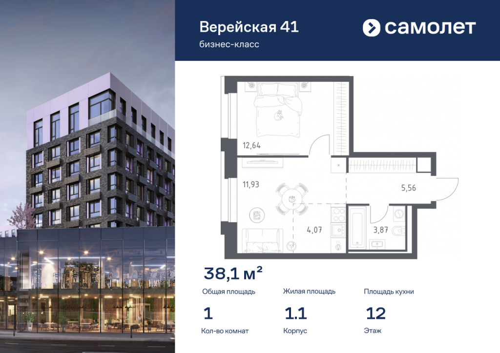 Строим кварталы для жизни с заботой о будущем. Предлагается 1-комнатная квартира бизнес-класса 38,07 кв.м в корпусе 1.1 на 12 этаже, в «Верейская 41» Квартира без отделки. Доступность опции «отделка» и возможность комплектации мебелью и декором уточняйте у застройщика. Приобрести квартиру возможно по специальным акциям от застройщика, с текущими условиями акций можно ознакомиться в блоке «Акций». Цена динамическая и может отличаться, уточняйте актуальность у застройщика. «Верейская 41» — проект бизнес-класса рядом с «Долиной реки Сетунь» и Кутузовским проспектом. Из панорамных окон открываются виды на природный заказник. Комплекс включает 4 урбан-блока высотой до 14 этажей, зеленые террасы, сад с навесами из растений, спортивные и игровые площадки, плоскостной и 2 подземных паркинга. Планировки сдаются с дизайнерской отделкой в природных тонах.