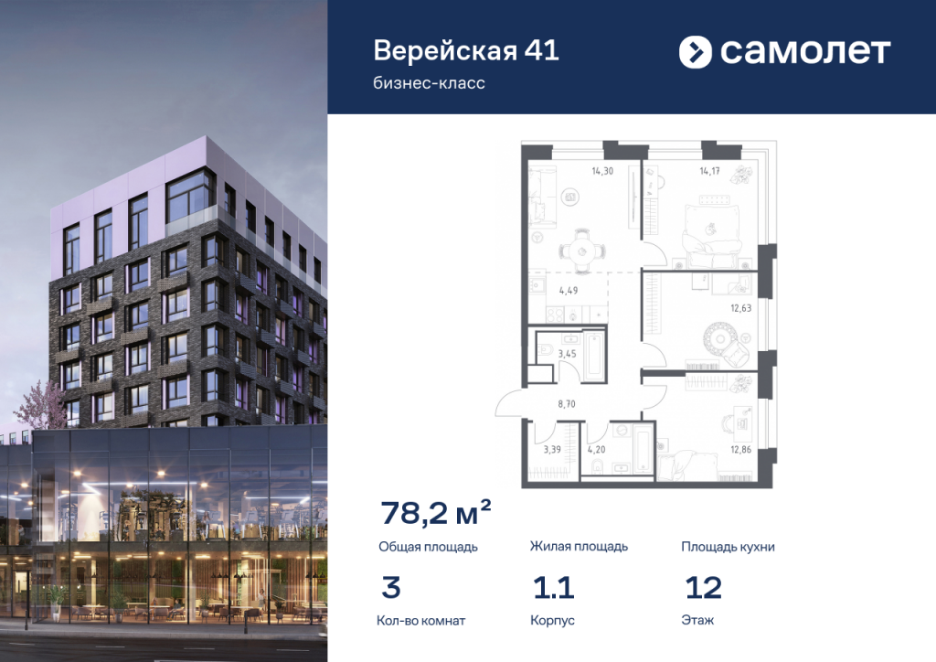 Строим кварталы для жизни с заботой о будущем. Предлагается 3-комнатная квартира бизнес-класса 78,19 кв.м в корпусе 1.1 на 12 этаже, в «Верейская 41» Квартира без отделки. Доступность опции «отделка» и возможность комплектации мебелью и декором уточняйте у застройщика. Приобрести квартиру возможно по специальным акциям от застройщика, с текущими условиями акций можно ознакомиться в блоке «Акций». Цена динамическая и может отличаться, уточняйте актуальность у застройщика. «Верейская 41» — проект бизнес-класса рядом с «Долиной реки Сетунь» и Кутузовским проспектом. Из панорамных окон открываются виды на природный заказник. Комплекс включает 4 урбан-блока высотой до 14 этажей, зеленые террасы, сад с навесами из растений, спортивные и игровые площадки, плоскостной и 2 подземных паркинга. Планировки сдаются с дизайнерской отделкой в природных тонах.
