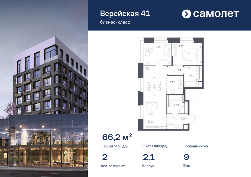 Строим кварталы для жизни с заботой о будущем. Предлагается 2-комнатная квартира бизнес-класса 66,23 кв.м в корпусе 2.1 на 9 этаже, в «Верейская 41» Квартира без отделки. Доступность опции «отделка» и возможность комплектации мебелью и декором уточняйте у застройщика. Приобрести квартиру возможно по специальным акциям от застройщика, с текущими условиями акций можно ознакомиться в блоке «Акций». Цена динамическая и может отличаться, уточняйте актуальность у застройщика. «Верейская 41» — проект бизнес-класса рядом с «Долиной реки Сетунь» и Кутузовским проспектом. Из панорамных окон открываются виды на природный заказник. Комплекс включает 4 урбан-блока высотой до 14 этажей, зеленые террасы, сад с навесами из растений, спортивные и игровые площадки, плоскостной и 2 подземных паркинга. Планировки сдаются с дизайнерской отделкой в природных тонах.