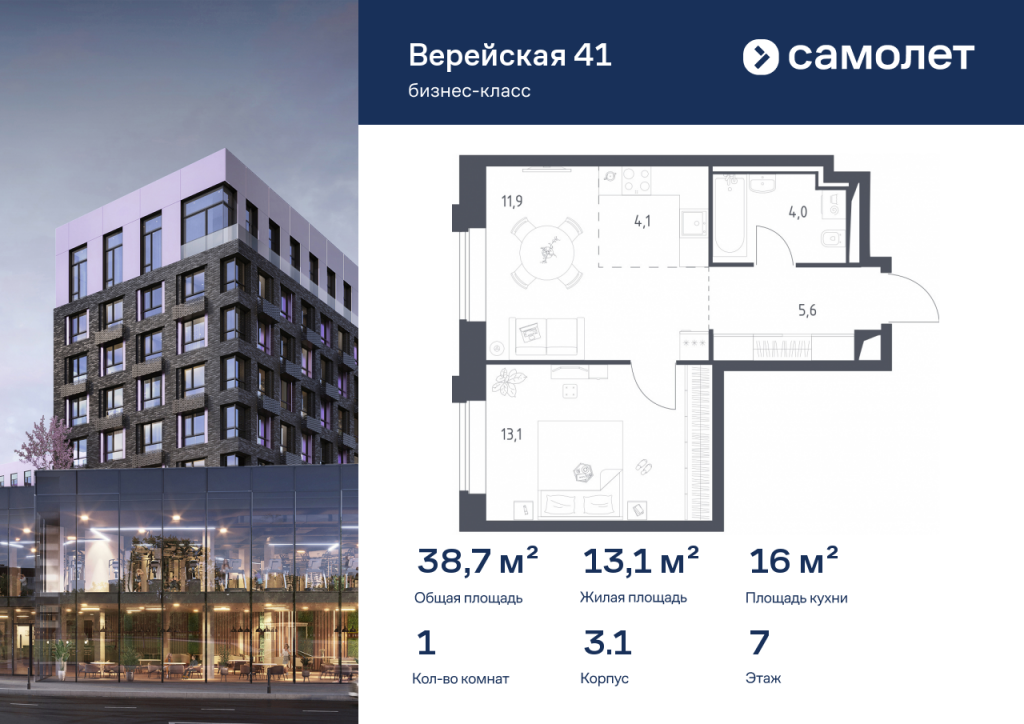 Строим кварталы для жизни с заботой о будущем. Предлагается 1-комнатная квартира бизнес-класса 38,68 кв.м в корпусе 3.1 на 7 этаже, в «Верейская 41» Квартира без отделки. Доступность опции «отделка» и возможность комплектации мебелью и декором уточняйте у застройщика. Приобрести квартиру возможно по специальным акциям от застройщика, с текущими условиями акций можно ознакомиться в блоке «Акций». Цена динамическая и может отличаться, уточняйте актуальность у застройщика. «Верейская 41» — проект бизнес-класса рядом с «Долиной реки Сетунь» и Кутузовским проспектом. Из панорамных окон открываются виды на природный заказник. Комплекс включает 4 урбан-блока высотой до 14 этажей, зеленые террасы, сад с навесами из растений, спортивные и игровые площадки, плоскостной и 2 подземных паркинга. Планировки сдаются с дизайнерской отделкой в природных тонах.
