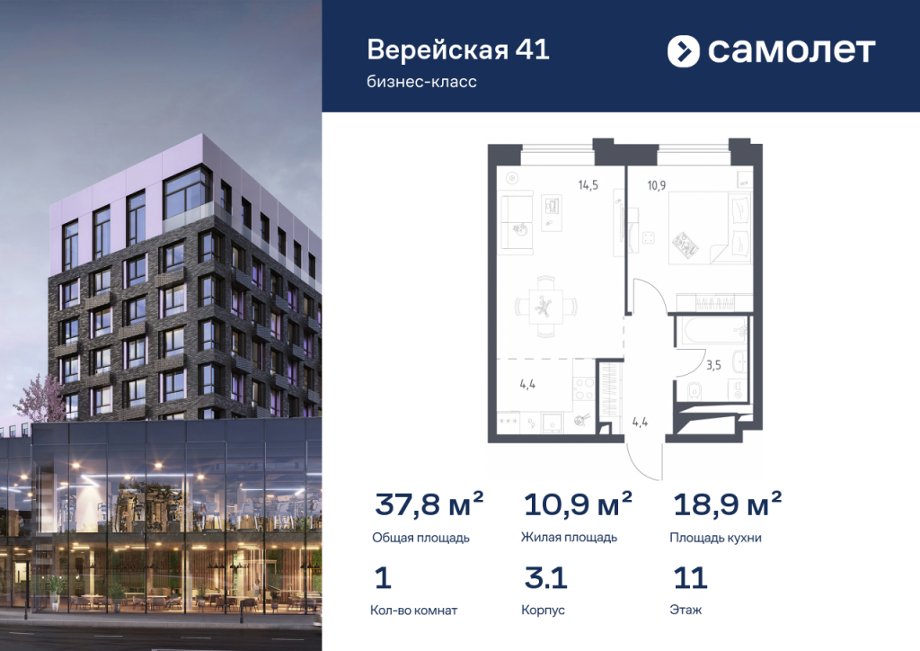 Строим кварталы для жизни с заботой о будущем. Предлагается 1-комнатная квартира бизнес-класса 37,75 кв.м в корпусе 3.1 на 11 этаже, в «Верейская 41» Квартира с предчистовой отделкой. Доступность дополнительных опций уточняйте у застройщика. Приобрести квартиру возможно по специальным акциям от застройщика, с текущими условиями акций можно ознакомиться в блоке «Акций». Цена динамическая и может отличаться, уточняйте актуальность у застройщика. «Верейская 41» — проект бизнес-класса рядом с «Долиной реки Сетунь» и Кутузовским проспектом. Из панорамных окон открываются виды на природный заказник. Комплекс включает 4 урбан-блока высотой до 14 этажей, зеленые террасы, сад с навесами из растений, спортивные и игровые площадки, плоскостной и 2 подземных паркинга. Планировки сдаются с дизайнерской отделкой в природных тонах.