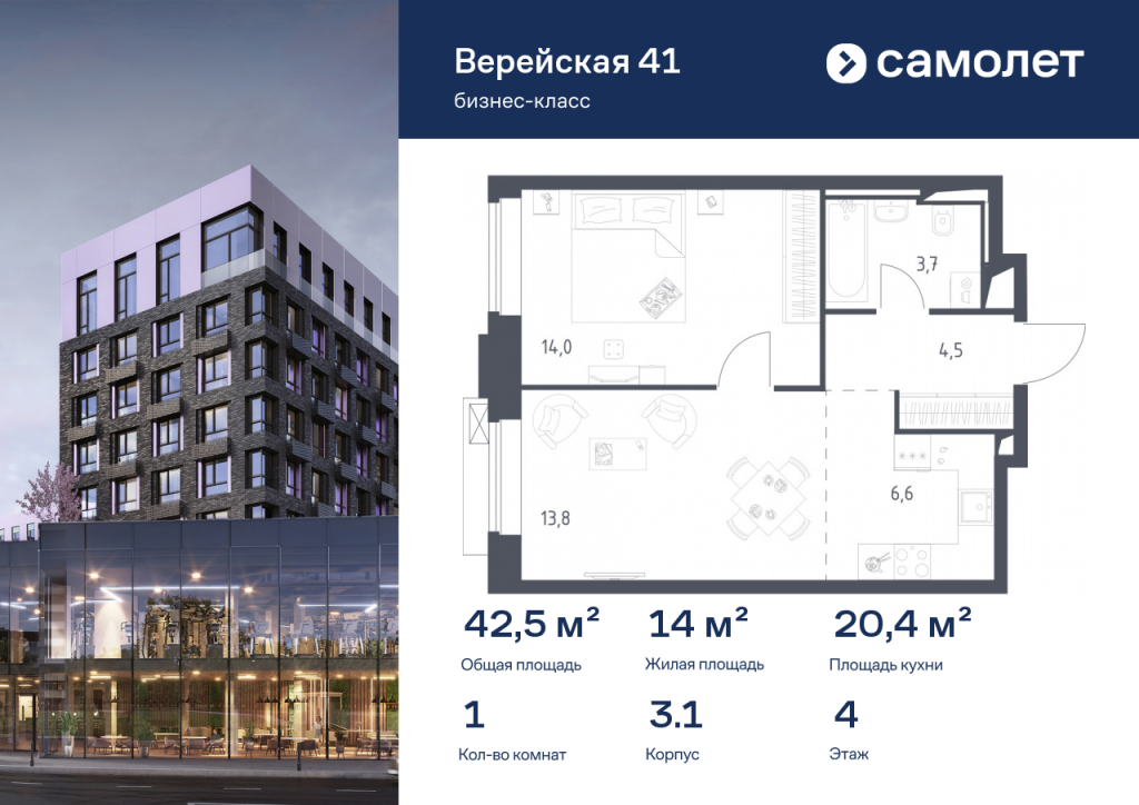 Строим кварталы для жизни с заботой о будущем. Предлагается 1-комнатная квартира бизнес-класса 42,48 кв.м в корпусе 3.1 на 4 этаже, в «Верейская 41» Квартира с предчистовой отделкой. Доступность дополнительных опций уточняйте у застройщика. Приобрести квартиру возможно по специальным акциям от застройщика, с текущими условиями акций можно ознакомиться в блоке «Акций». Цена динамическая и может отличаться, уточняйте актуальность у застройщика. «Верейская 41» — проект бизнес-класса рядом с «Долиной реки Сетунь» и Кутузовским проспектом. Из панорамных окон открываются виды на природный заказник. Комплекс включает 4 урбан-блока высотой до 14 этажей, зеленые террасы, сад с навесами из растений, спортивные и игровые площадки, плоскостной и 2 подземных паркинга. Планировки сдаются с дизайнерской отделкой в природных тонах.