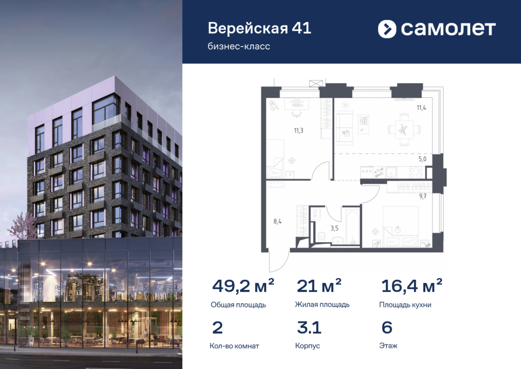 Строим кварталы для жизни с заботой о будущем. Предлагается 2-комнатная квартира бизнес-класса 49,22 кв.м в корпусе 3.1 на 6 этаже, в «Верейская 41» Квартира с предчистовой отделкой. Доступность дополнительных опций уточняйте у застройщика. Приобрести квартиру возможно по специальным акциям от застройщика, с текущими условиями акций можно ознакомиться в блоке «Акций». Цена динамическая и может отличаться, уточняйте актуальность у застройщика. «Верейская 41» — проект бизнес-класса рядом с «Долиной реки Сетунь» и Кутузовским проспектом. Из панорамных окон открываются виды на природный заказник. Комплекс включает 4 урбан-блока высотой до 14 этажей, зеленые террасы, сад с навесами из растений, спортивные и игровые площадки, плоскостной и 2 подземных паркинга. Планировки сдаются с дизайнерской отделкой в природных тонах.