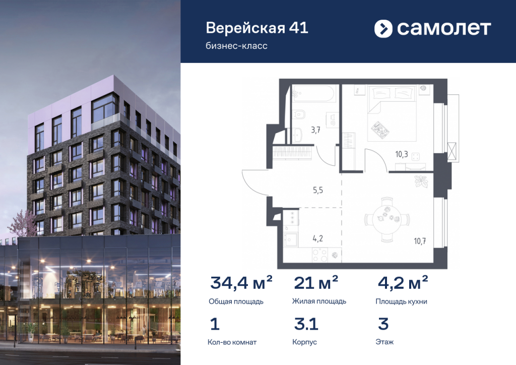 Строим кварталы для жизни с заботой о будущем. Предлагается 1-комнатная квартира бизнес-класса 34,4 кв.м в корпусе 3.1 на 3 этаже, в «Верейская 41» Квартира без отделки. Доступность опции «отделка» и возможность комплектации мебелью и декором уточняйте у застройщика. Приобрести квартиру возможно по специальным акциям от застройщика, с текущими условиями акций можно ознакомиться в блоке «Акций». Цена динамическая и может отличаться, уточняйте актуальность у застройщика. «Верейская 41» — проект бизнес-класса рядом с «Долиной реки Сетунь» и Кутузовским проспектом. Из панорамных окон открываются виды на природный заказник. Комплекс включает 4 урбан-блока высотой до 14 этажей, зеленые террасы, сад с навесами из растений, спортивные и игровые площадки, плоскостной и 2 подземных паркинга. Планировки сдаются с дизайнерской отделкой в природных тонах.