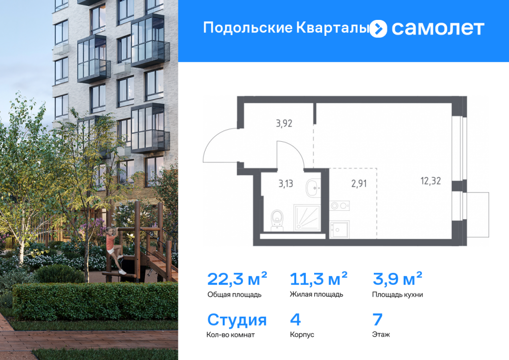 Строим кварталы для жизни с заботой о будущем. Предлагается квартира студия комфорт-класса 22,28 кв.м в корпусе 4 на 7 этаже, в ЖК «Подольские Кварталы» Квартира без отделки. Доступность опции «отделка» и возможность комплектации мебелью и декором уточняйте у застройщика. Приобрести квартиру возможно по специальным акциям от застройщика, с текущими условиями акций можно ознакомиться в блоке «Акций». Цена динамическая и может отличаться, уточняйте актуальность у застройщика. «Подольские кварталы» — жилой комплекс в Новой Москве, рядом с Дубровицким лесом и рекой Десной. До станции МЦД-2 "Остафьево" - 5 минут на общественном транспорте, до станции МЦД-2 «Силикатная» — 8 минут на машине. Рядом — музей-заповедник «Остафьево», усадьбы Плещеево и Дубровицы. В квартале будут детский сад на 200 мест и учебно-воспитательный комплекс на 1 500 мест, в который войдут школа и детский сад. Первые этажи жилых корпусов займут квартиры, кафе, магазины и салоны красоты. Дворы-парки будут радовать жителей цветением и зеленью: здесь высадят липы, сосны, ели, клены и сирень. Плэйхаб станет местом встреч всех любителей активного отдыха: застройщик оборудует зоны тренажеров и воркаута, площадки для игр в настольный теннис, мяч, шахматы. Также появятся современные игровые площадки для детей. Для автовладельцев предусмотрен многоуровневый паркинг. В проекте — монолитные дома высотой от 9 до 12 этажей. Теплые оттенки фасадов соответствуют дизайн-коду «Янтарный берег». Фасады облицованы ложковой кирпичной кладкой.