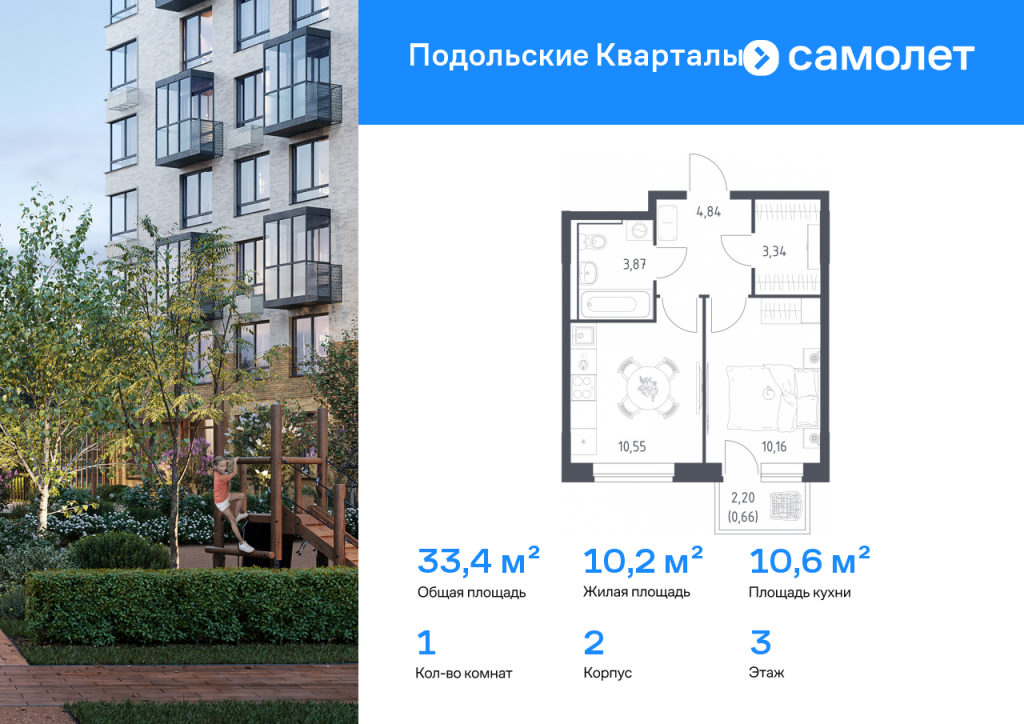 Строим кварталы для жизни с заботой о будущем. Предлагается 1-комнатная квартира комфорт-класса 33,42 кв.м в корпусе 2 на 3 этаже, в ЖК «Подольские Кварталы» Квартира без отделки. Доступность опции «отделка» и возможность комплектации мебелью и декором уточняйте у застройщика. Приобрести квартиру возможно по специальным акциям от застройщика, с текущими условиями акций можно ознакомиться в блоке «Акций». Цена динамическая и может отличаться, уточняйте актуальность у застройщика. «Подольские кварталы» — жилой комплекс в Новой Москве, рядом с Дубровицким лесом и рекой Десной. До станции МЦД-2 "Остафьево" - 5 минут на общественном транспорте, до станции МЦД-2 «Силикатная» — 8 минут на машине. Рядом — музей-заповедник «Остафьево», усадьбы Плещеево и Дубровицы. В квартале будут детский сад на 200 мест и учебно-воспитательный комплекс на 1 500 мест, в который войдут школа и детский сад. Первые этажи жилых корпусов займут квартиры, кафе, магазины и салоны красоты. Дворы-парки будут радовать жителей цветением и зеленью: здесь высадят липы, сосны, ели, клены и сирень. Плэйхаб станет местом встреч всех любителей активного отдыха: застройщик оборудует зоны тренажеров и воркаута, площадки для игр в настольный теннис, мяч, шахматы. Также появятся современные игровые площадки для детей. Для автовладельцев предусмотрен многоуровневый паркинг. В проекте — монолитные дома высотой от 9 до 12 этажей. Теплые оттенки фасадов соответствуют дизайн-коду «Янтарный берег». Фасады облицованы ложковой кирпичной кладкой.