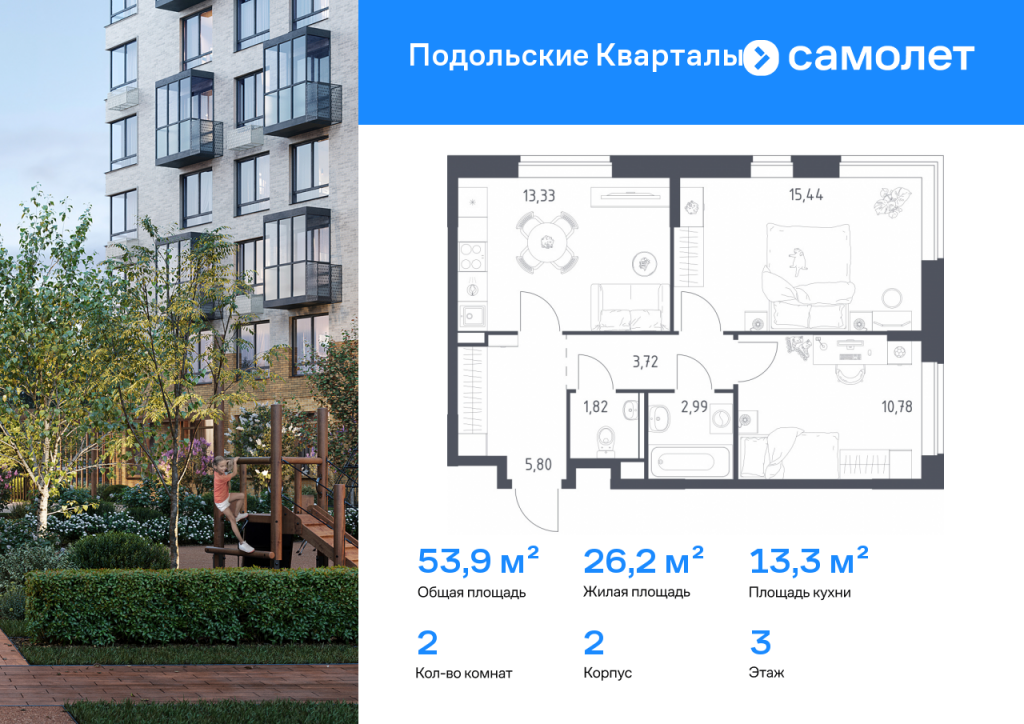 Строим кварталы для жизни с заботой о будущем. Предлагается 2-комнатная квартира комфорт-класса 53,88 кв.м в корпусе 2 на 3 этаже, в ЖК «Подольские Кварталы» Квартира без отделки. Доступность опции «отделка» и возможность комплектации мебелью и декором уточняйте у застройщика. Приобрести квартиру возможно по специальным акциям от застройщика, с текущими условиями акций можно ознакомиться в блоке «Акций». Цена динамическая и может отличаться, уточняйте актуальность у застройщика. «Подольские кварталы» — жилой комплекс в Новой Москве, рядом с Дубровицким лесом и рекой Десной. До станции МЦД-2 "Остафьево" - 5 минут на общественном транспорте, до станции МЦД-2 «Силикатная» — 8 минут на машине. Рядом — музей-заповедник «Остафьево», усадьбы Плещеево и Дубровицы. В квартале будут детский сад на 200 мест и учебно-воспитательный комплекс на 1 500 мест, в который войдут школа и детский сад. Первые этажи жилых корпусов займут квартиры, кафе, магазины и салоны красоты. Дворы-парки будут радовать жителей цветением и зеленью: здесь высадят липы, сосны, ели, клены и сирень. Плэйхаб станет местом встреч всех любителей активного отдыха: застройщик оборудует зоны тренажеров и воркаута, площадки для игр в настольный теннис, мяч, шахматы. Также появятся современные игровые площадки для детей. Для автовладельцев предусмотрен многоуровневый паркинг. В проекте — монолитные дома высотой от 9 до 12 этажей. Теплые оттенки фасадов соответствуют дизайн-коду «Янтарный берег». Фасады облицованы ложковой кирпичной кладкой.
