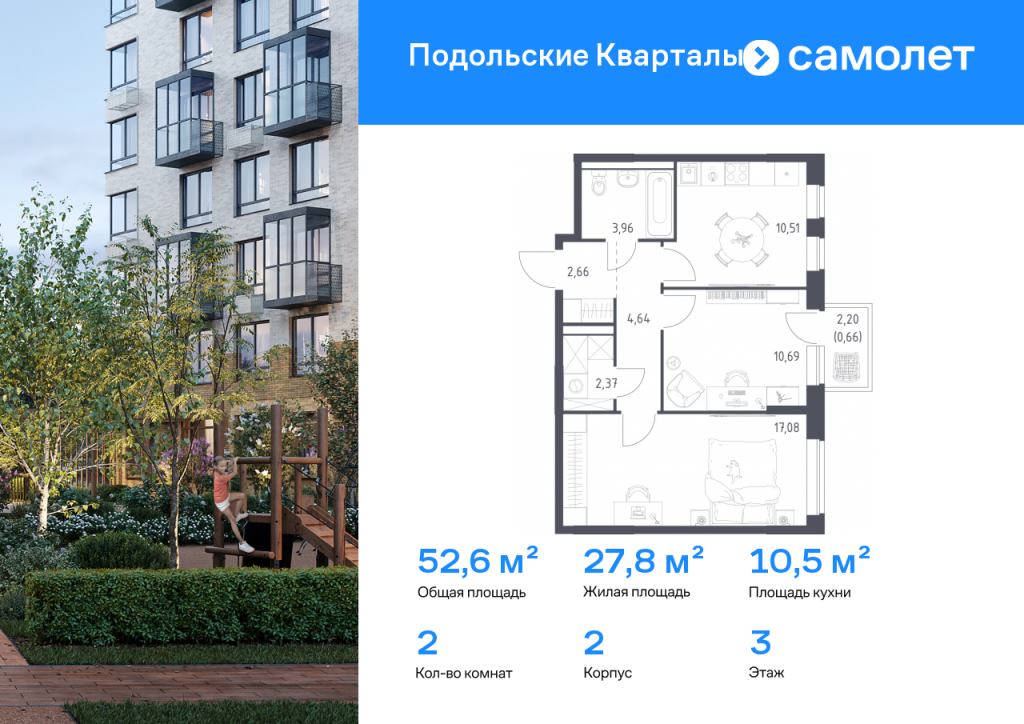Строим кварталы для жизни с заботой о будущем. Предлагается 2-комнатная квартира комфорт-класса 52,57 кв.м в корпусе 2 на 3 этаже, в ЖК «Подольские Кварталы» Квартира без отделки. Доступность опции «отделка» и возможность комплектации мебелью и декором уточняйте у застройщика. Приобрести квартиру возможно по специальным акциям от застройщика, с текущими условиями акций можно ознакомиться в блоке «Акций». Цена динамическая и может отличаться, уточняйте актуальность у застройщика. «Подольские кварталы» — жилой комплекс в Новой Москве, рядом с Дубровицким лесом и рекой Десной. До станции МЦД-2 "Остафьево" - 5 минут на общественном транспорте, до станции МЦД-2 «Силикатная» — 8 минут на машине. Рядом — музей-заповедник «Остафьево», усадьбы Плещеево и Дубровицы. В квартале будут детский сад на 200 мест и учебно-воспитательный комплекс на 1 500 мест, в который войдут школа и детский сад. Первые этажи жилых корпусов займут квартиры, кафе, магазины и салоны красоты. Дворы-парки будут радовать жителей цветением и зеленью: здесь высадят липы, сосны, ели, клены и сирень. Плэйхаб станет местом встреч всех любителей активного отдыха: застройщик оборудует зоны тренажеров и воркаута, площадки для игр в настольный теннис, мяч, шахматы. Также появятся современные игровые площадки для детей. Для автовладельцев предусмотрен многоуровневый паркинг. В проекте — монолитные дома высотой от 9 до 12 этажей. Теплые оттенки фасадов соответствуют дизайн-коду «Янтарный берег». Фасады облицованы ложковой кирпичной кладкой.