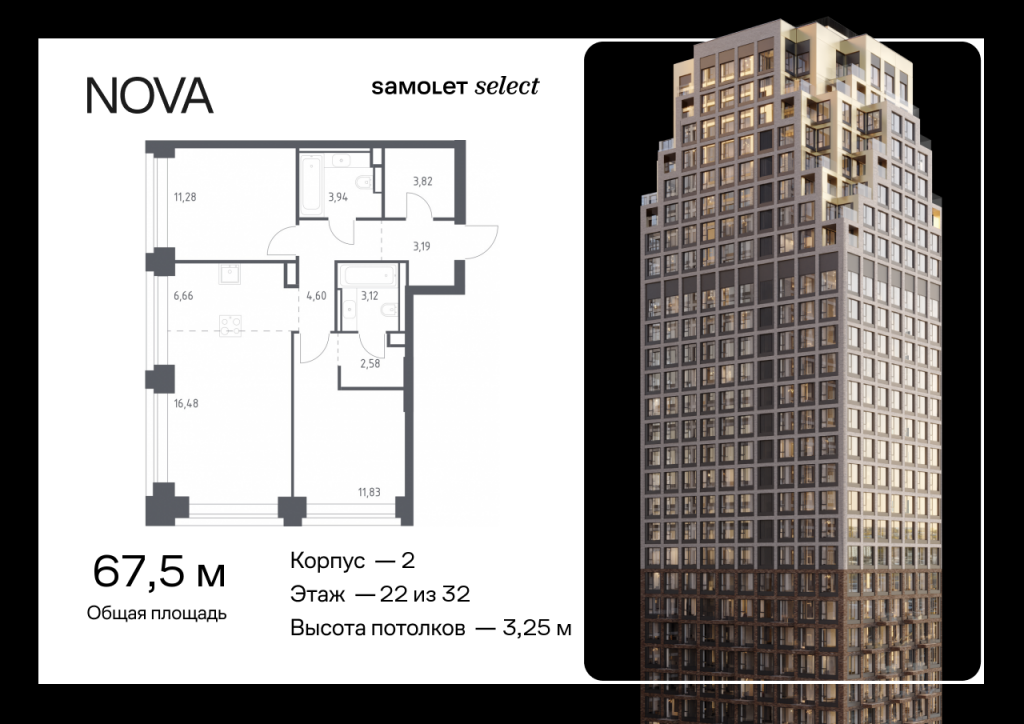 Строим кварталы для жизни с заботой о будущем. Предлагается 2-комнатная квартира премиум-класса 67,5 кв.м в корпусе 2 на 22 этаже, в ЖК «NOVA» Квартира без отделки. Доступность опции «отделка» и возможность комплектации мебелью и декором уточняйте у застройщика. Приобрести квартиру возможно по специальным акциям от застройщика, с текущими условиями акций можно ознакомиться в блоке «Акций». Цена динамическая и может отличаться, уточняйте актуальность у застройщика. «NOVA» — первый проект в премиальной линейке Samolet Select. Возводится в престижных Раменках и вблизи Кутузовского проспекта. Шесть корпусов переменной этажности повторяют очертания горных вершин и воплощают концепцию проекта-скалы: возвышающийся над городом ансамбль дает то же ощущение масштаба и ясности. Утопающая в зелени «Долина реки Сетунь», гастрономические точки, кинотеатр под открытым небом, бизнес-центр и фитнес-клуб — все это делает NOVA самодостаточным, но чувствующим пульс города пространством.