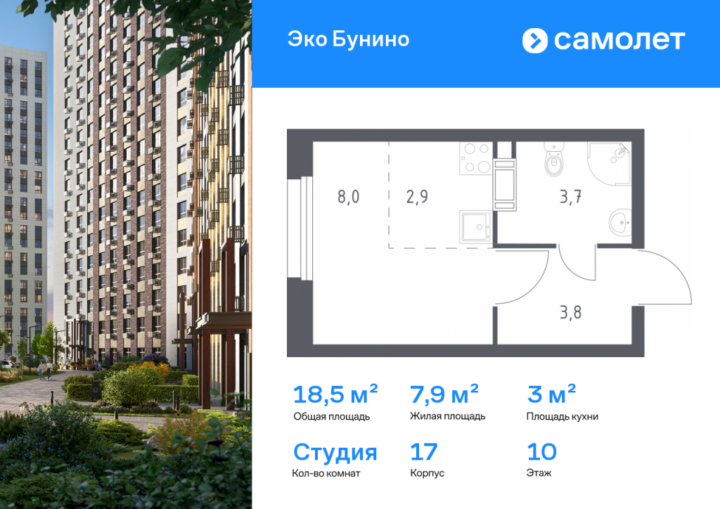 Строим кварталы для жизни с заботой о будущем. Предлагается квартира студия комфорт-класса 18,5 кв.м в корпусе 17 на 10 этаже, в ЖК «Эко Бунино» Квартира без отделки. Доступность опции «отделка» и возможность комплектации мебелью и декором уточняйте у застройщика. Приобрести квартиру возможно по специальным акциям от застройщика, с текущими условиями акций можно ознакомиться в блоке «Акций». Цена динамическая и может отличаться, уточняйте актуальность у застройщика. «Эко Бунино» — жилой комплекс в Новой Москве, полностью готовый для жизни. Уже построены школа и детские сады, открыты ледовая арена и магазины. Рядом — 2 станции метро и 3 лесопарка для прогулок. До станции метро «Новомосковская» — 20 минут пешком по экотропе. Во дворах-парках, закрытых от машин, комфортно и безопасно гулять. Здесь высажены уже взрослые деревья, которые создают прохладную тень в жаркий день. Ребенок любого возраста найдет увлекательное занятие в уже готовом плейхабе с большой горкой в виде слона и уникальным игровым оборудованием. Пока дети играют, родители могут прогуляться по бульвару или отдохнуть под навесом из растений. «Эко Бунино» — это 19 монолитных домов переменной этажности. Для облицовки используется навесной вентилируемый фасад и клинкерная плитка, которая имитирует кирпич. Переменная этажность обеспечивает хорошую инсоляцию дворов: в солнечные дни на территории особенно приятно гулять.