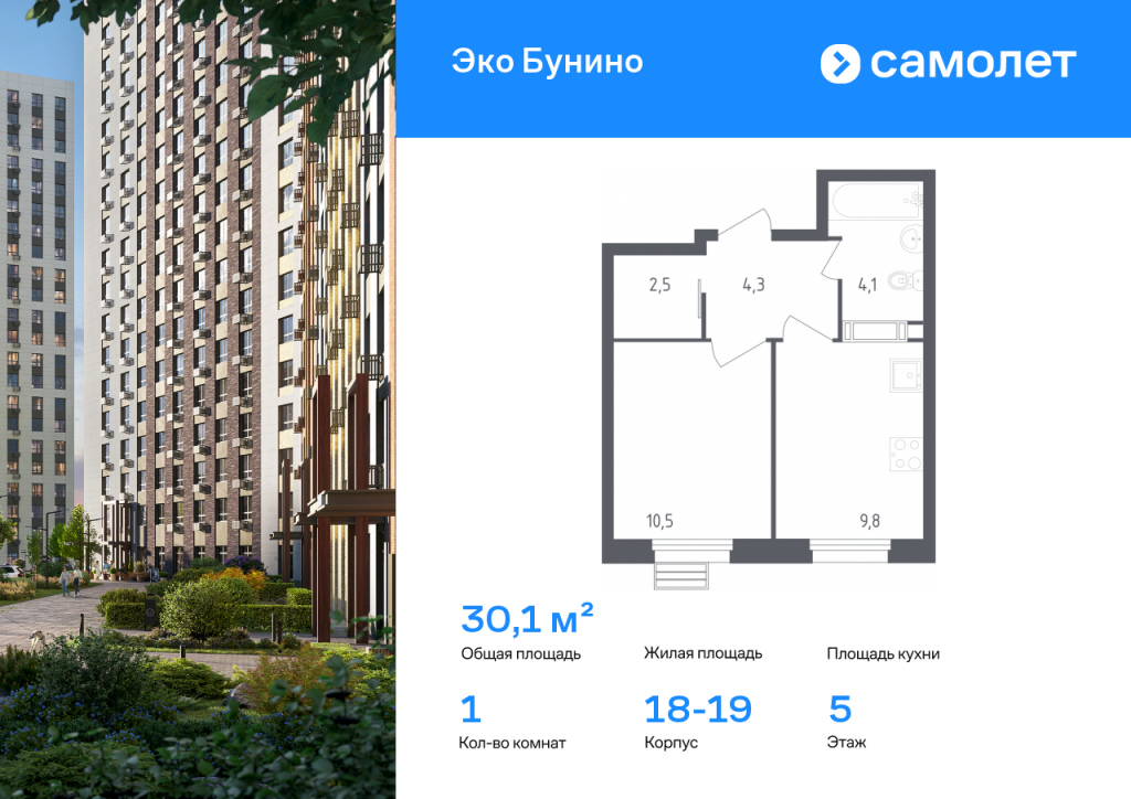 Строим кварталы для жизни с заботой о будущем. Предлагается 1-комнатная квартира комфорт-класса 30,1 кв.м в корпусе 18-19 на 5 этаже, в ЖК «Эко Бунино» Квартира с чистовой отделкой. Доступность дополнительных опций уточняйте у застройщика. Приобрести квартиру возможно по специальным акциям от застройщика, с текущими условиями акций можно ознакомиться в блоке «Акций». Цена динамическая и может отличаться, уточняйте актуальность у застройщика. «Эко Бунино» — жилой комплекс в Новой Москве, полностью готовый для жизни. Уже построены школа и детские сады, открыты ледовая арена и магазины. Рядом — 2 станции метро и 3 лесопарка для прогулок. До станции метро «Новомосковская» — 20 минут пешком по экотропе. Во дворах-парках, закрытых от машин, комфортно и безопасно гулять. Здесь высажены уже взрослые деревья, которые создают прохладную тень в жаркий день. Ребенок любого возраста найдет увлекательное занятие в уже готовом плейхабе с большой горкой в виде слона и уникальным игровым оборудованием. Пока дети играют, родители могут прогуляться по бульвару или отдохнуть под навесом из растений. «Эко Бунино» — это 19 монолитных домов переменной этажности. Для облицовки используется навесной вентилируемый фасад и клинкерная плитка, которая имитирует кирпич. Переменная этажность обеспечивает хорошую инсоляцию дворов: в солнечные дни на территории особенно приятно гулять.