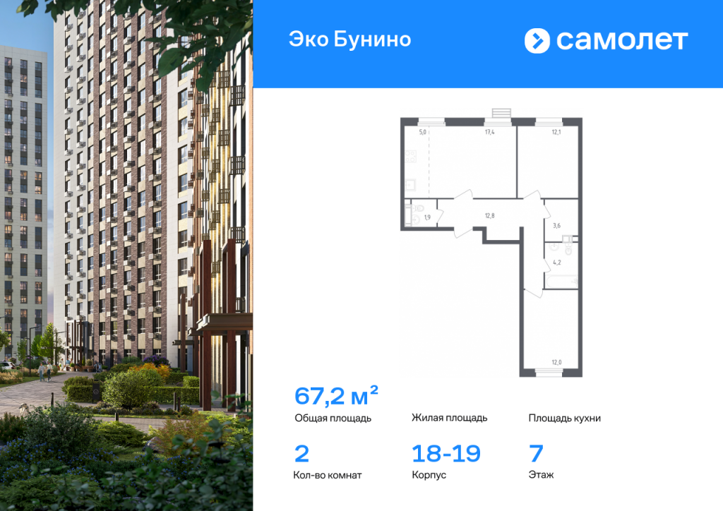 Строим кварталы для жизни с заботой о будущем. Предлагается 2-комнатная квартира комфорт-класса 67,2 кв.м в корпусе 18-19 на 7 этаже, в ЖК «Эко Бунино» Квартира с чистовой отделкой. Доступность дополнительных опций уточняйте у застройщика. Приобрести квартиру возможно по специальным акциям от застройщика, с текущими условиями акций можно ознакомиться в блоке «Акций». Цена динамическая и может отличаться, уточняйте актуальность у застройщика. «Эко Бунино» — жилой комплекс в Новой Москве, полностью готовый для жизни. Уже построены школа и детские сады, открыты ледовая арена и магазины. Рядом — 2 станции метро и 3 лесопарка для прогулок. До станции метро «Новомосковская» — 20 минут пешком по экотропе. Во дворах-парках, закрытых от машин, комфортно и безопасно гулять. Здесь высажены уже взрослые деревья, которые создают прохладную тень в жаркий день. Ребенок любого возраста найдет увлекательное занятие в уже готовом плейхабе с большой горкой в виде слона и уникальным игровым оборудованием. Пока дети играют, родители могут прогуляться по бульвару или отдохнуть под навесом из растений. «Эко Бунино» — это 19 монолитных домов переменной этажности. Для облицовки используется навесной вентилируемый фасад и клинкерная плитка, которая имитирует кирпич. Переменная этажность обеспечивает хорошую инсоляцию дворов: в солнечные дни на территории особенно приятно гулять.