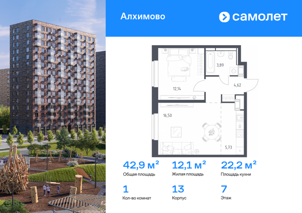 Строим кварталы для жизни с заботой о будущем. Предлагается 1-комнатная квартира комфорт-класса 42,9 кв.м в корпусе 13 на 7 этаже, в ЖК «Алхимово» Квартира с чистовой отделкой. Доступность дополнительных опций уточняйте у застройщика. Приобрести квартиру возможно по специальным акциям от застройщика, с текущими условиями акций можно ознакомиться в блоке «Акций». Цена динамическая и может отличаться, уточняйте актуальность у застройщика. «Алхимово» — жилой комплекс в Новой Москве, в 16 км от МКАД. Рядом — живописный Дубровицкий лесопарк и река Десна. На территории уже есть свои школа и детский сад, ведется строительство еще одного детского сада. Супермаркеты, аптеки и кафе — в паре шагов от дома. В будущем появится свой торговый центр. В квартале есть воркаут-зона, игровые площадки, отдельная площадка для выгула собак. Дворы закрыты от машин, для автомобилистов предусмотрен многоуровневый паркинг. В проекте — монолитные дома высотой от 8 до 16 этажей. Фасады облицованы декоративным кирпичом естественных оттенков.