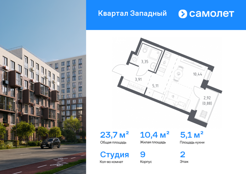 Строим кварталы для жизни с заботой о будущем. Предлагается квартира студия комфорт-класса 23,69 кв.м в корпусе 9 на 2 этаже, в ЖК «Квартал Западный» Квартира без отделки. Доступность опции «отделка» и возможность комплектации мебелью и декором уточняйте у застройщика. Приобрести квартиру возможно по специальным акциям от застройщика, с текущими условиями акций можно ознакомиться в блоке «Акций». Цена динамическая и может отличаться, уточняйте актуальность у застройщика. Жилой комплекс в окружении лесопарков и рядом с рекой. До станции МЦД-4 «Санино» можно дойти пешком за 7 минут, а на территории проекта появится транспортно-пересадочный узел с торговым центром. Для жителей построят школу, 2 детсада, в одном из которых будут развивающие кабинеты-трансформеры. Дворы — тихое зеленое пространство без машин. В проекте появится собственный ландшафтный парк с благоустроенной набережной и центральная площадь, на которой будут проводиться различные мероприятия. Высота домов — от 5 до 15 этажей. Фасады выполняют в естественных оттенках, в соответствии с дизайн-кодом «Полевой луг». У каждой секции — свое цветовое решение. Белый цвет верхних этажей добавляет застройке легкости. Фасады облицованы клинкерным глазурованным кирпичом, который используют в проектах бизнес-класса.