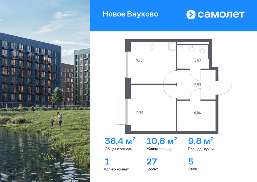 Строим кварталы для жизни с заботой о будущем. Предлагается 1-комнатная квартира комфорт-класса 36,38 кв.м в корпусе 27 на 5 этаже, в ЖК «Новое Внуково» Квартира с чистовой отделкой. Доступность дополнительных опций уточняйте у застройщика. Приобрести квартиру возможно по специальным акциям от застройщика, с текущими условиями акций можно ознакомиться в блоке «Акций». Цена динамическая и может отличаться, уточняйте актуальность у застройщика. «Новое Внуково» — это жилой комплекс в Новой Москве, у подножия берега реки Незнайка. Поблизости — живописные места для прогулок: народный парк «Ручеек», усадьба Старо-Никольское, Валуевский и Ульяновский лесопарки. Часть домов сдана и внутри района уже открыт детсад с бассейном, а в ближайшее время откроются еще 3 детсада, 2 школы и поликлиника. На территории проекта будет построен первый в России Центр Российской Федерации Баскетбола, где будут площадки с трибунами, тренажерный зал, кафе и конференц-зал. Дворы-парки закрыты от машин и посторонних. На территории — прогулочный маршрут вдоль реки Незнайка и набережная с шезлонгами и качелями для отдыха. Также здесь появится плейхаб «Незнайка на Луне», площадь для мероприятий с сухим фонтаном, летним кинотеатром и кафе. В жилом комплексе — монолитные дома высотой от 6 до 14 этажей. Фасады облицованы кирпичом природных оттенков.